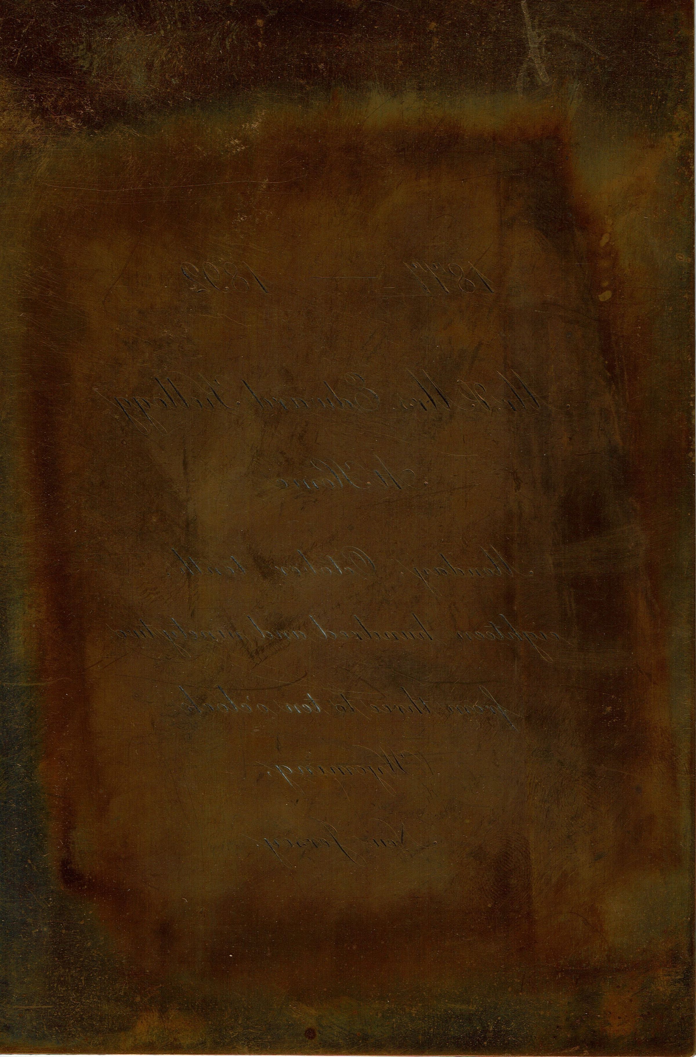 Engraved invitation and engraving plate for Mr. and Mrs. Edward Kellogg's 15th Wedding Anniversary celebration at their home, 471 Wyoming Avenue, on Monday, October 10, 1892.