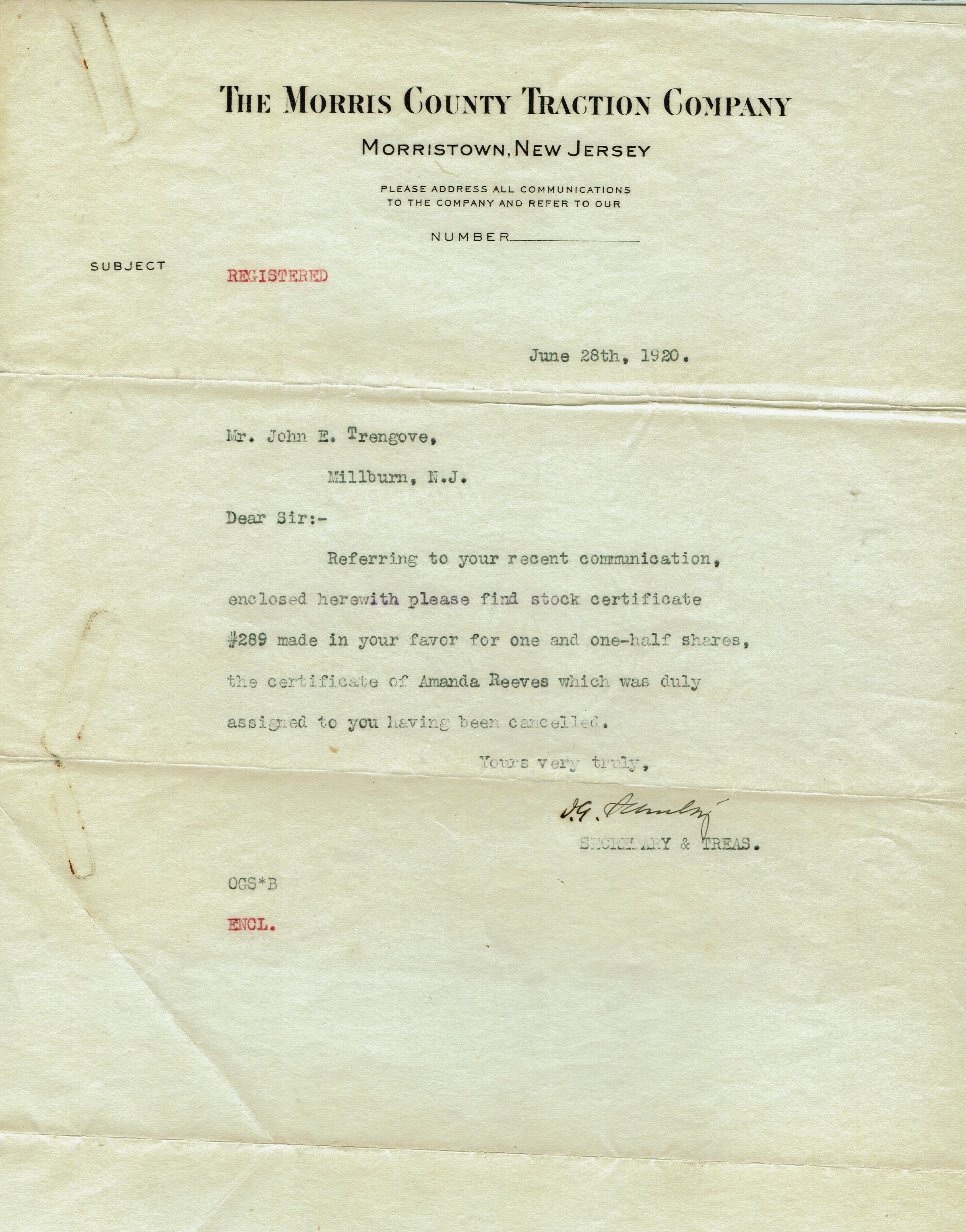 Morris Country Traction Company Gold Bond Certificate and 1920 Letter. The letter, dated June 28, 1920, is addressed to John E. Trengove, Millburn, NJ and is from the Secretary and Treasurer of the Morris Country Traction Company. The contents are as follows: Dear Sir..Referring to your recent communication, enclosed herewith please find stock certificate #289 made in your favor for one and one-half shares, the certificate of Amanda Reeves which was duly assigned to you having been cancelled.