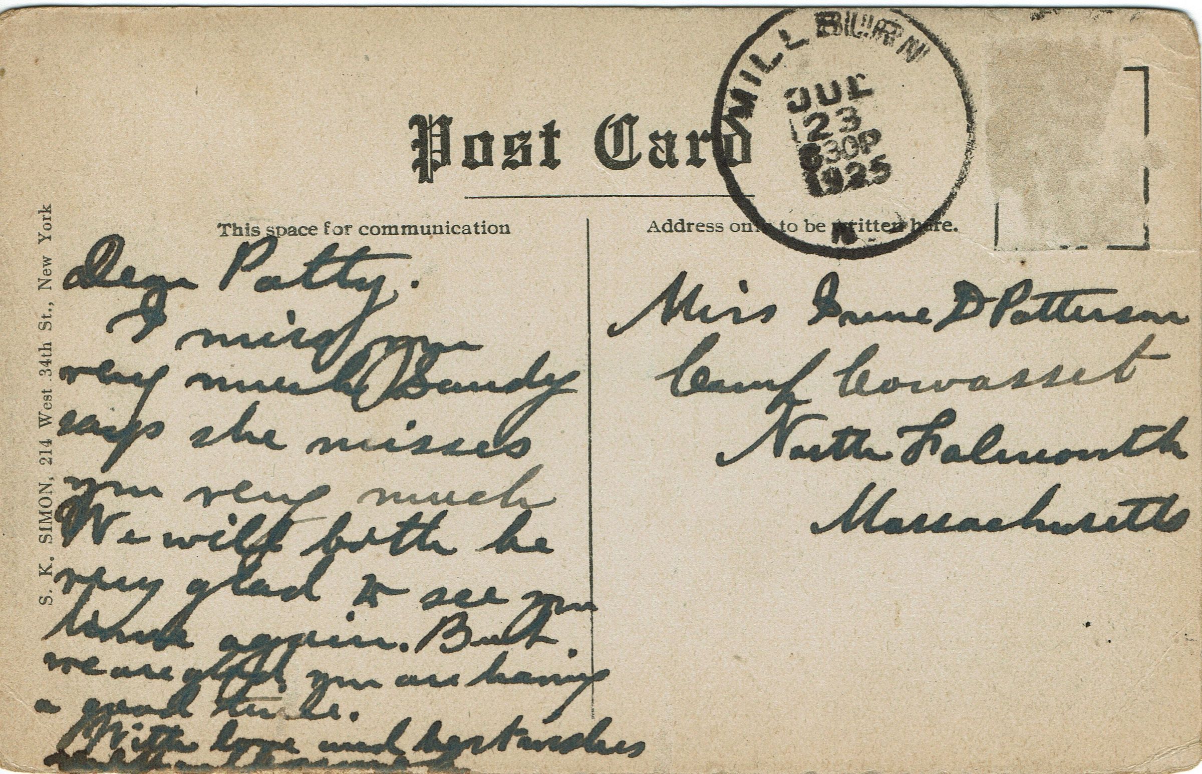 Postally used photographic postcard of North and South Pond, Short Hills, NJ. Postmarked Millburn, July 23, 1925 8:30 pm. Card is addressed to Miss Irene D. Patterson, North Falmouth, Massachusetts.
