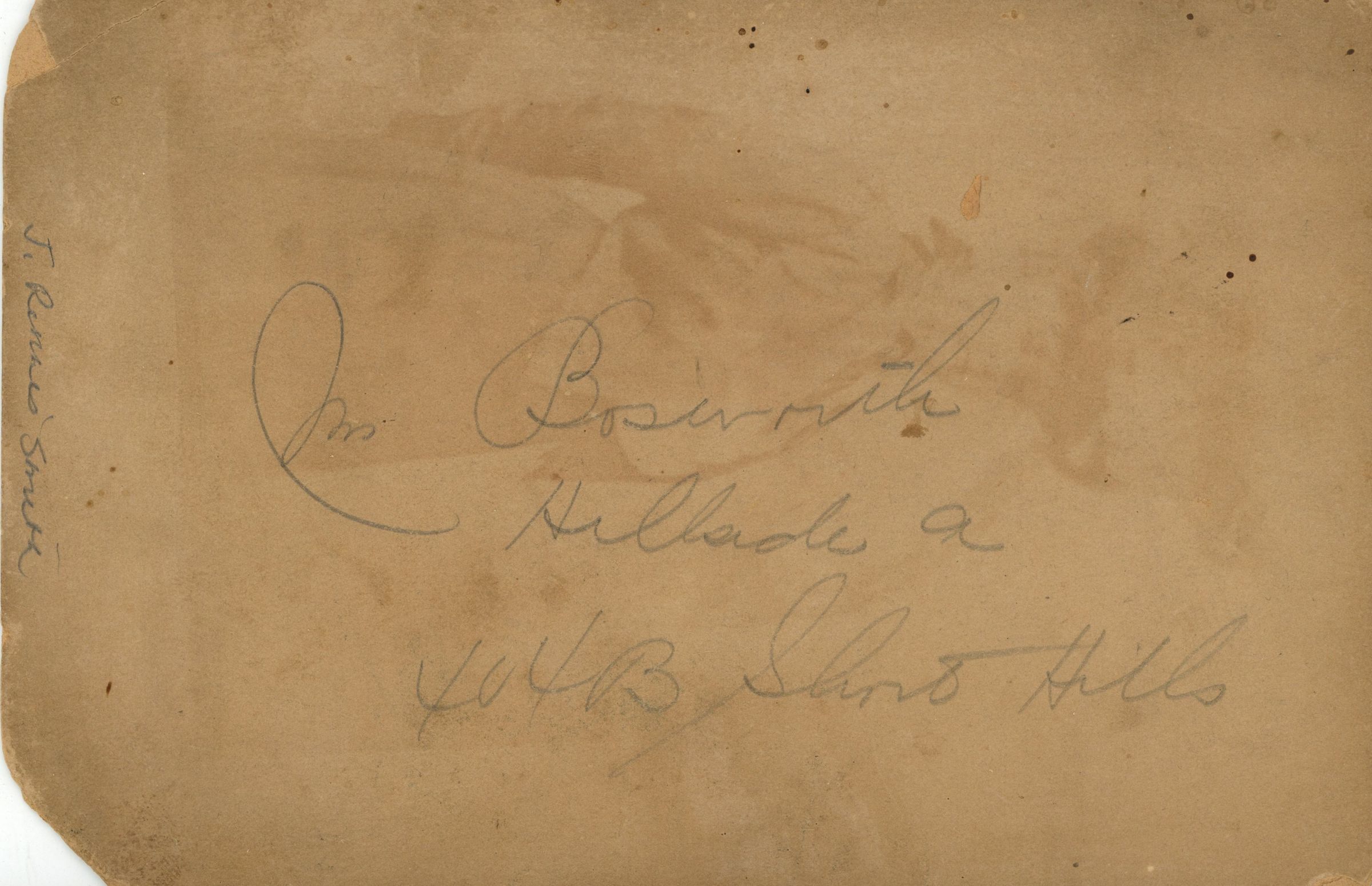 Photograph of an unidentified woman wearing a fancy scarf and brooch taken at J. Rennie Smith's photographic studio, 727 & 729 Broad Street, Newark New Jersey. Smith was a prominent photographer in Newark and Asbury Park 1880-1895. The photograph comes from the Bosworth collection of unidentified photos. The photograph has the following inscription on the verso: Mrs. Bosworth, Hillside at (Hobart ?), Short Hills. It may depict Sophia Bosworth (1865-1941).