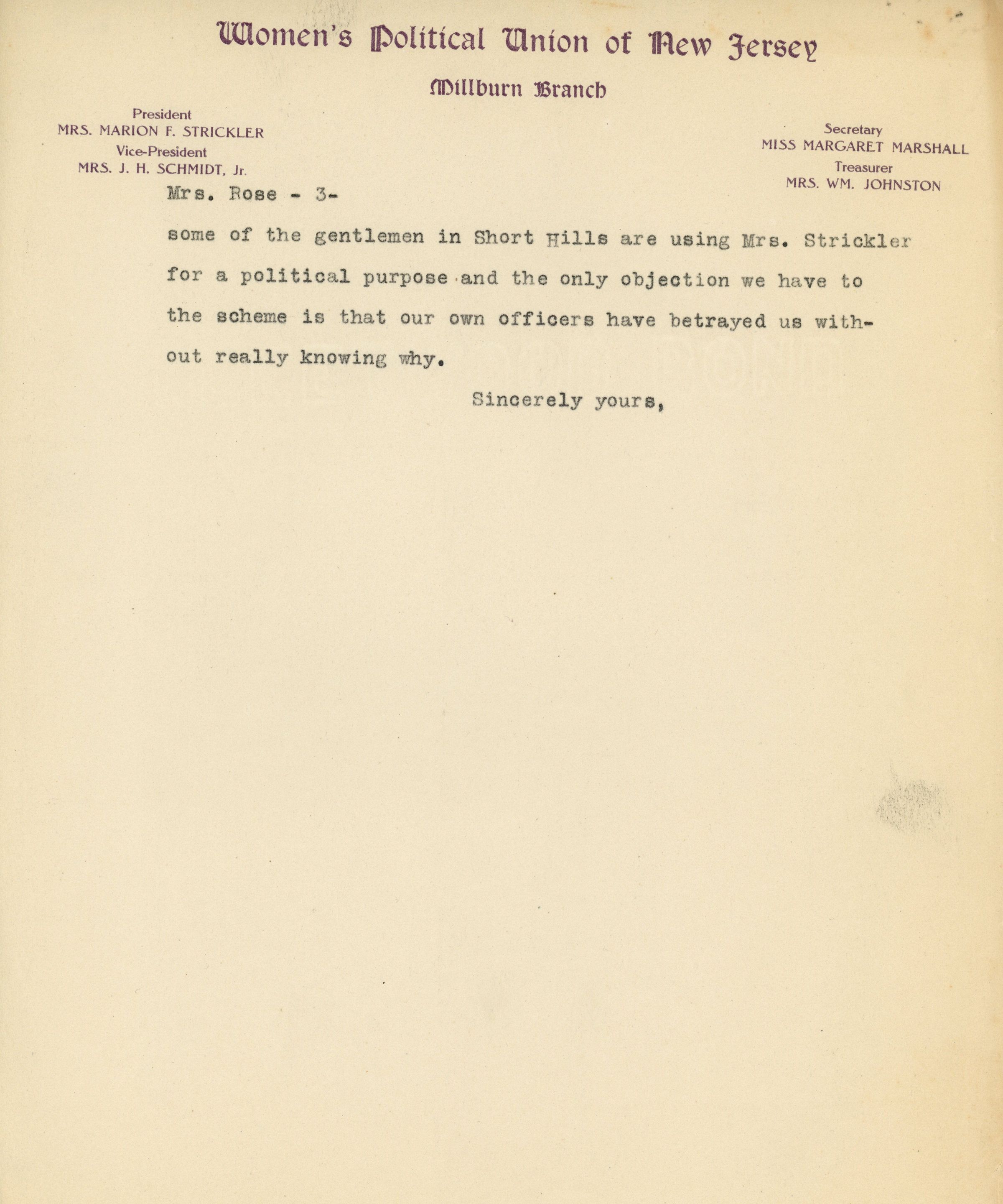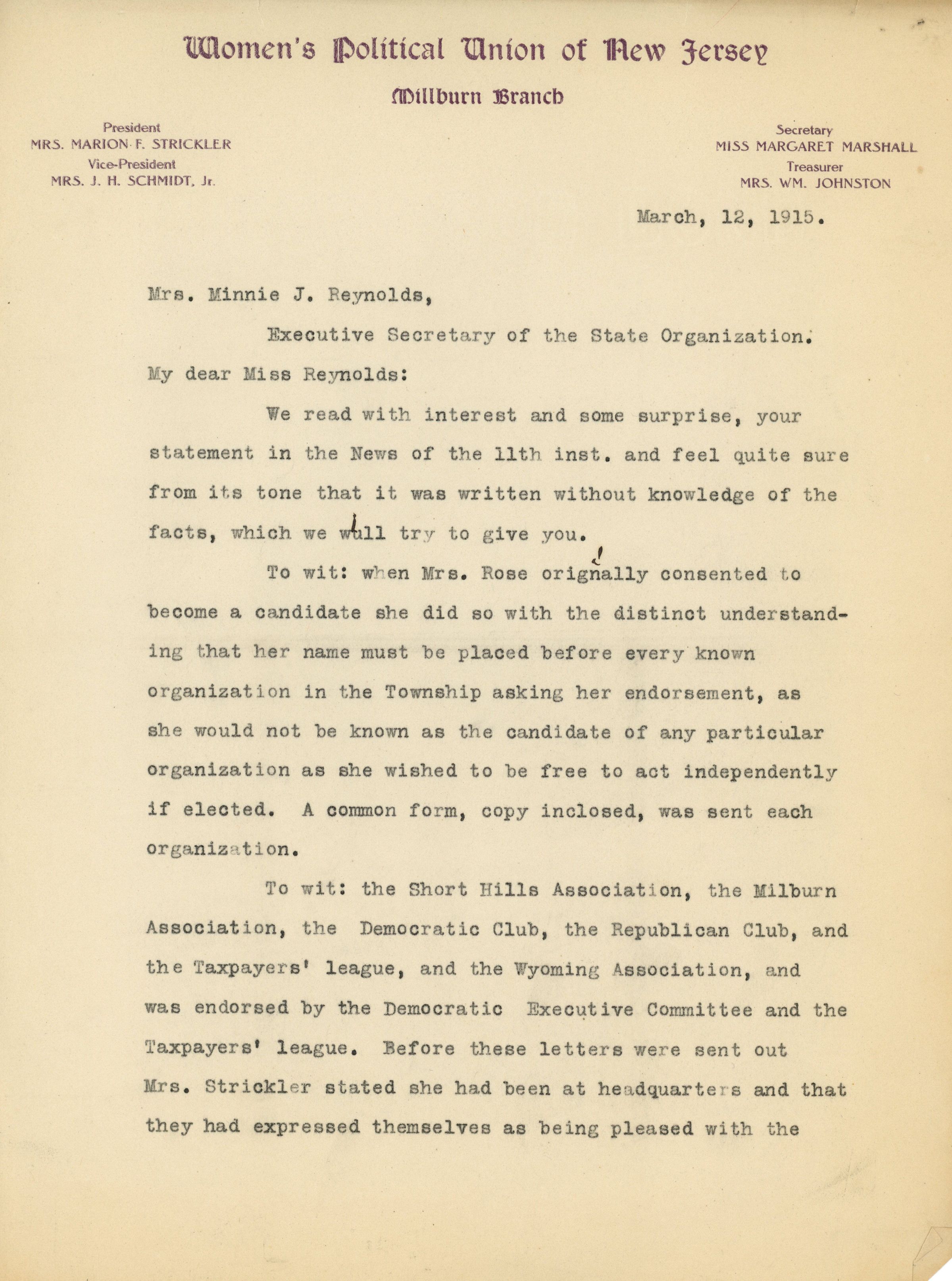 Three-page typed letter dated March 12, 1915 from Margaret Marshall to Minnie J. Reynolds from the State Branch of the Women's Political Union of New Jersey detailing the controversy over Marion Strickler's request for Cornelia Rose to withdraw her candidacy for Board of Education.