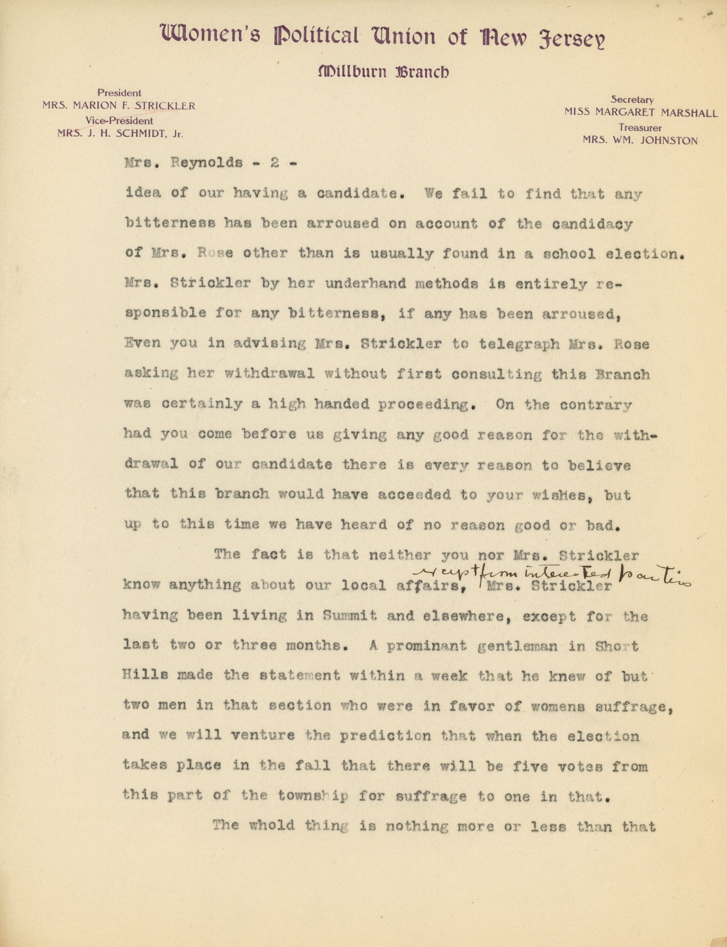 Millburn Women's Political Union: Margaret Marshall Letter to Minnie Reynolds, 1915