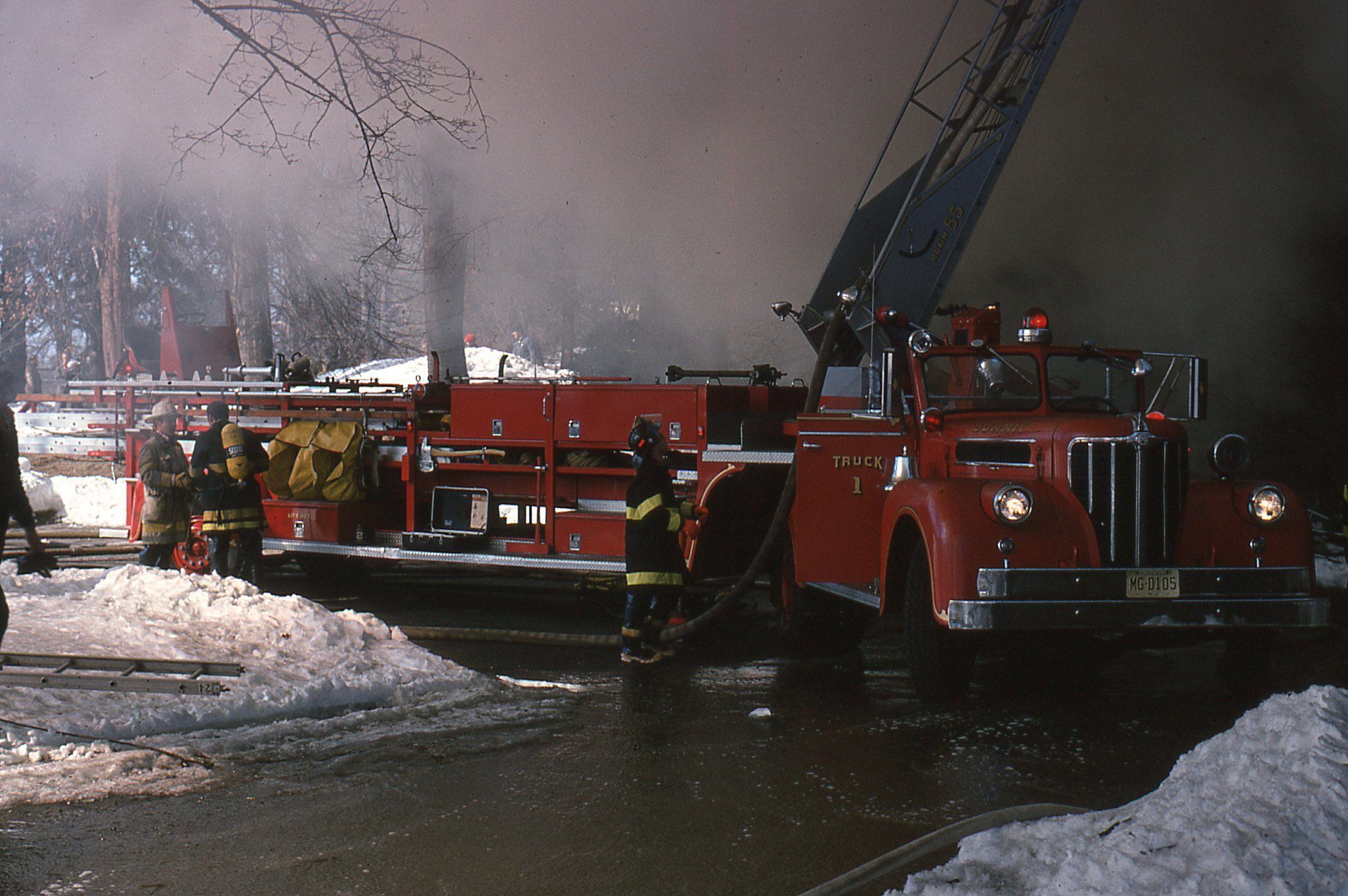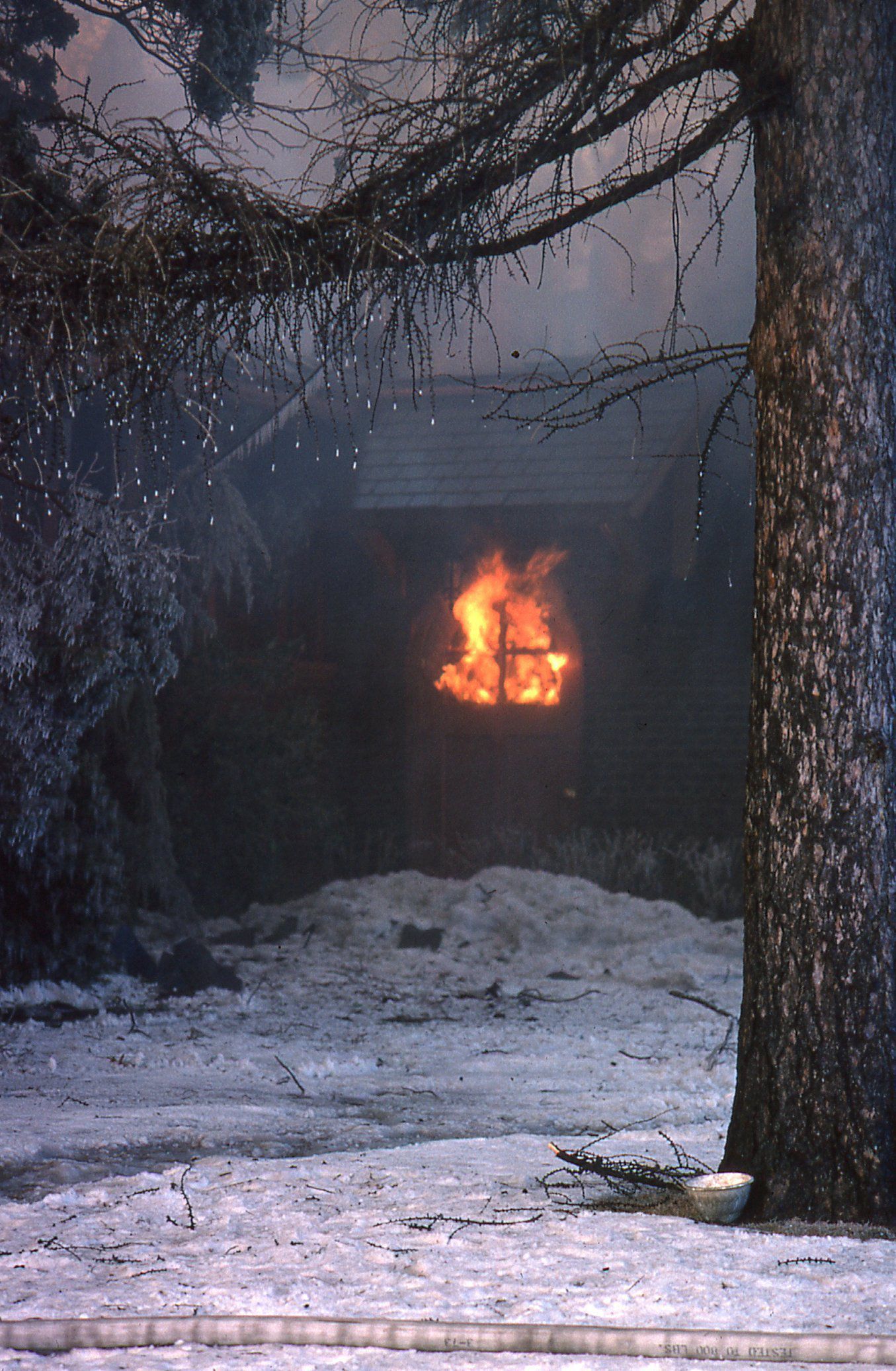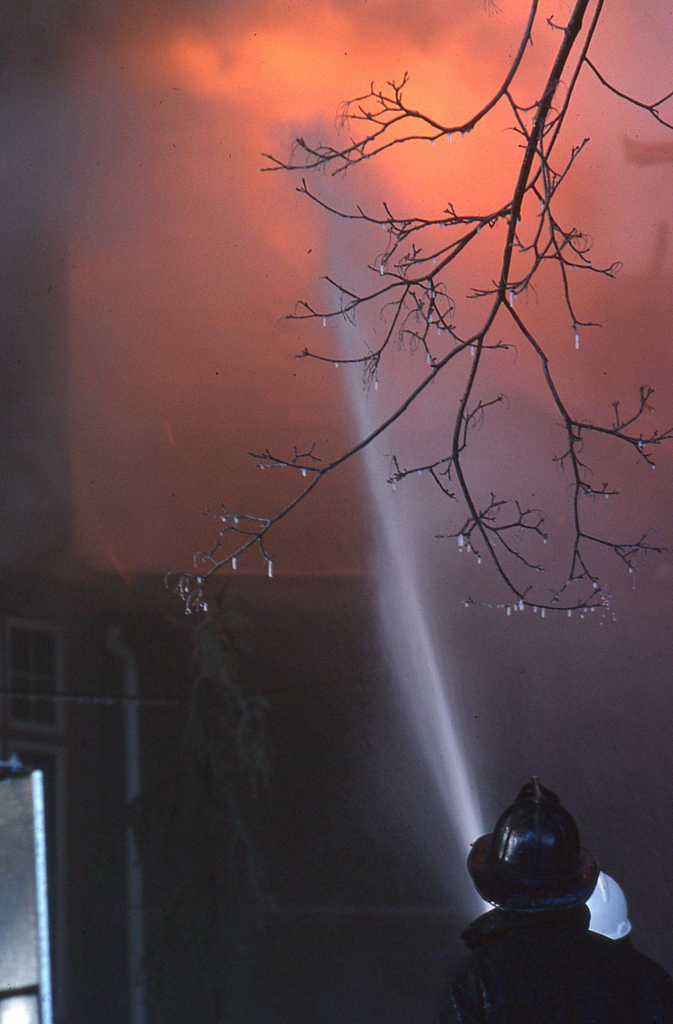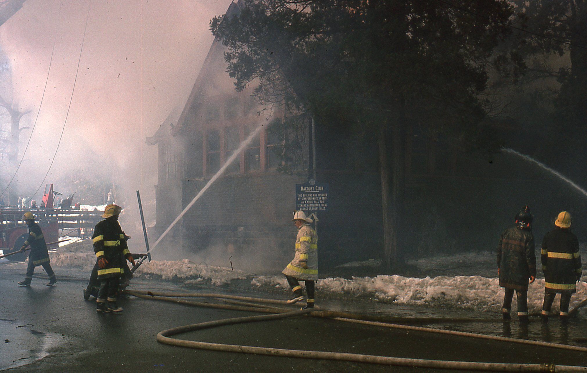 54 Color photographs of the fire that destroyed the Racquets Club in Short Hills in February 1978 taken by Peter Mackersie. The photographs focus on the fire, the firefighters, and the aftermath of the blaze.