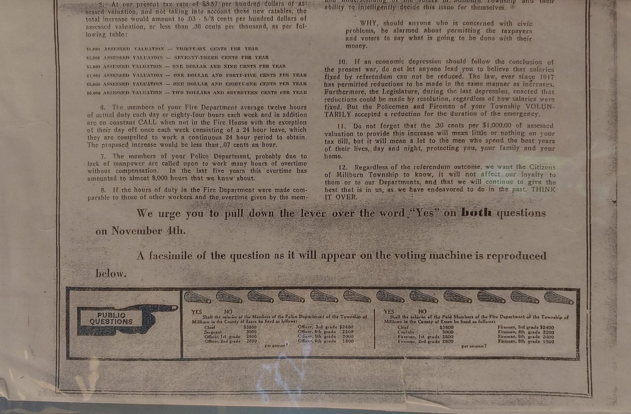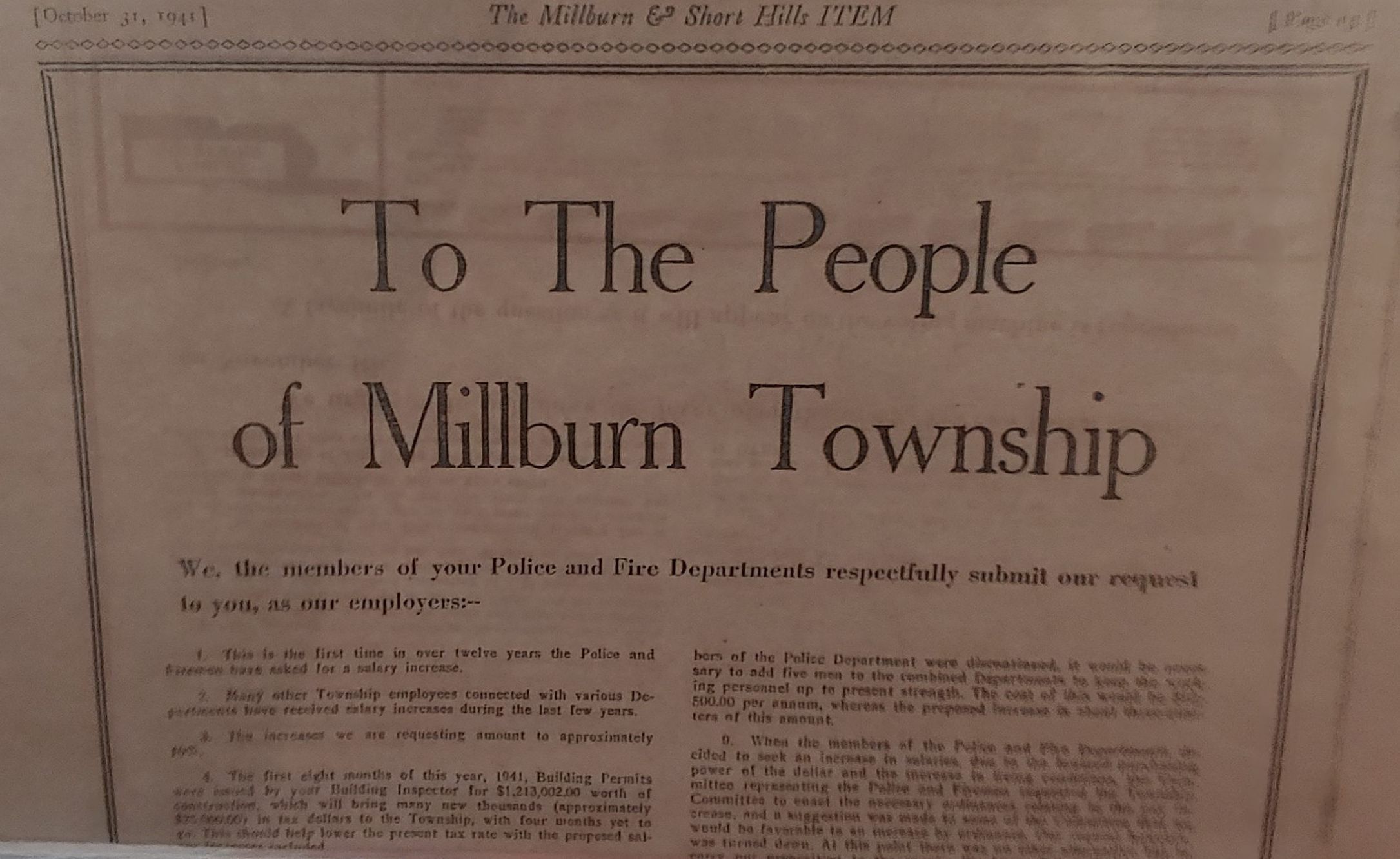 Fire Department: Millburn Short Hills ITEM letter to the people urging to increase fire and police salaries