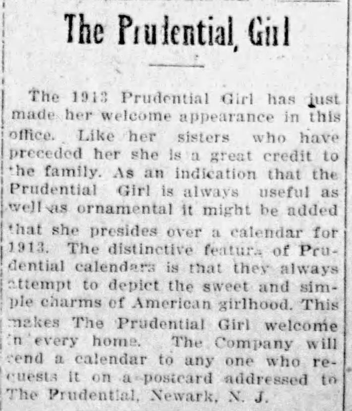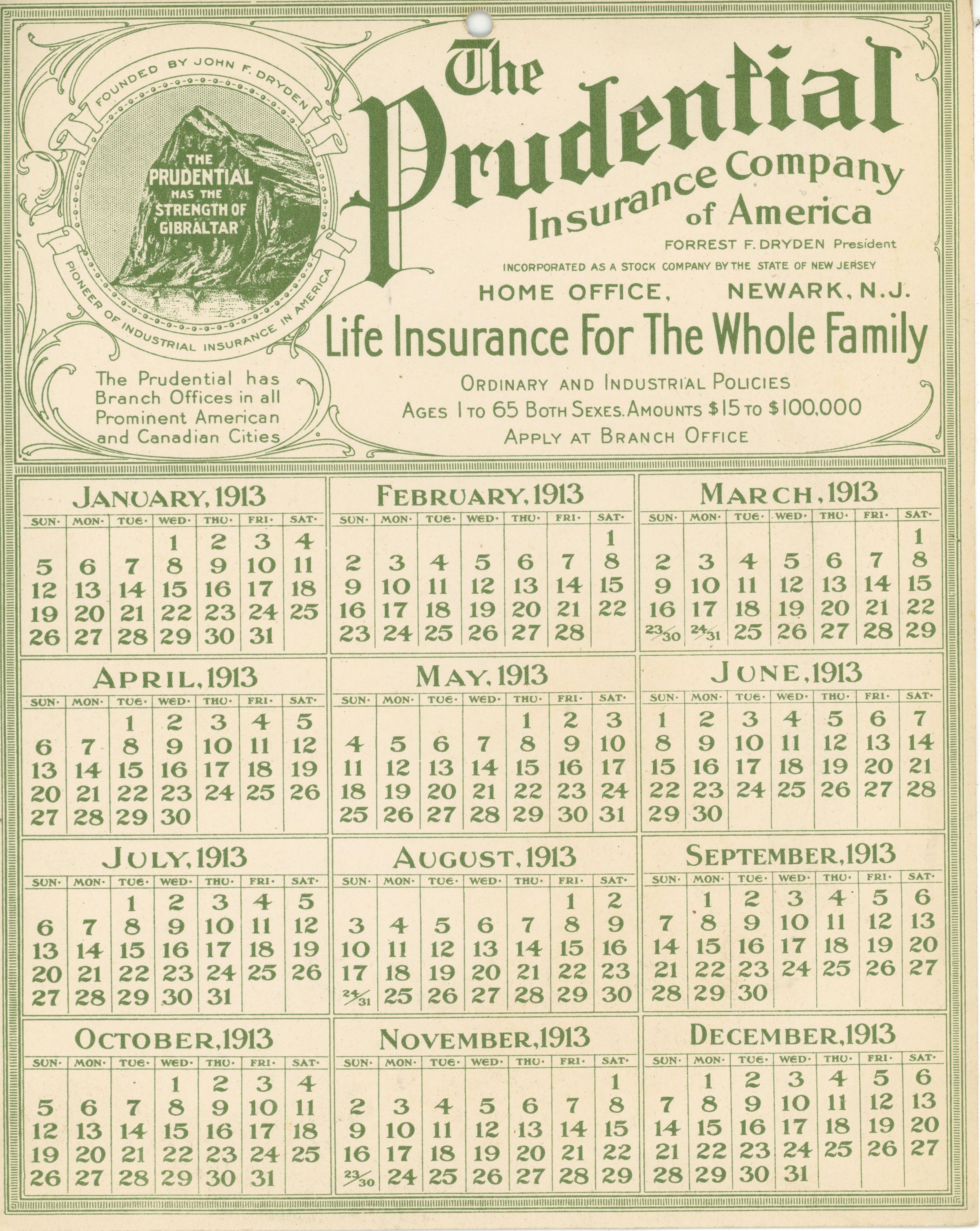 Prudential Insurance Company of America Calendar featuring "The Prudential Girl," 1913. Color Lithographic print with calendar on verso. Published by Ketterlinus, Philadelphia, c. 1912. "The Prudential Girl" was an ideal of femininity used to promote beauty and wholesomeness by the Prudential Insurance company for decades. She is described as useful and ornamental, a welcome addition to the office place, who is meant to depict the sweet and simple charms of American girlhood.
