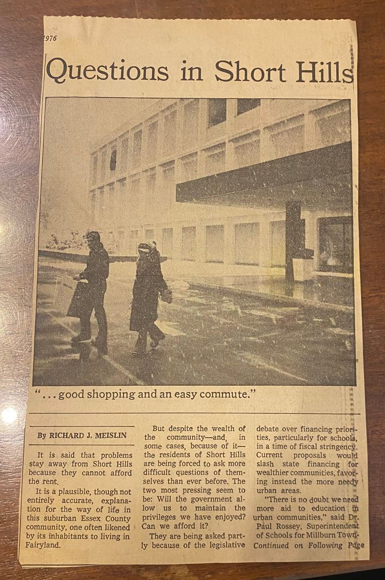 A newspaper clipping of a section by Richard J. Meislin titled "Questions in Short Hills." It describes the experience of living in Short Hills as "living in Fairyland," but details the problems associated with affording rent in the area and the involvement of the government in changing the way that Short Hills functioned at the time of this publication in 1976.