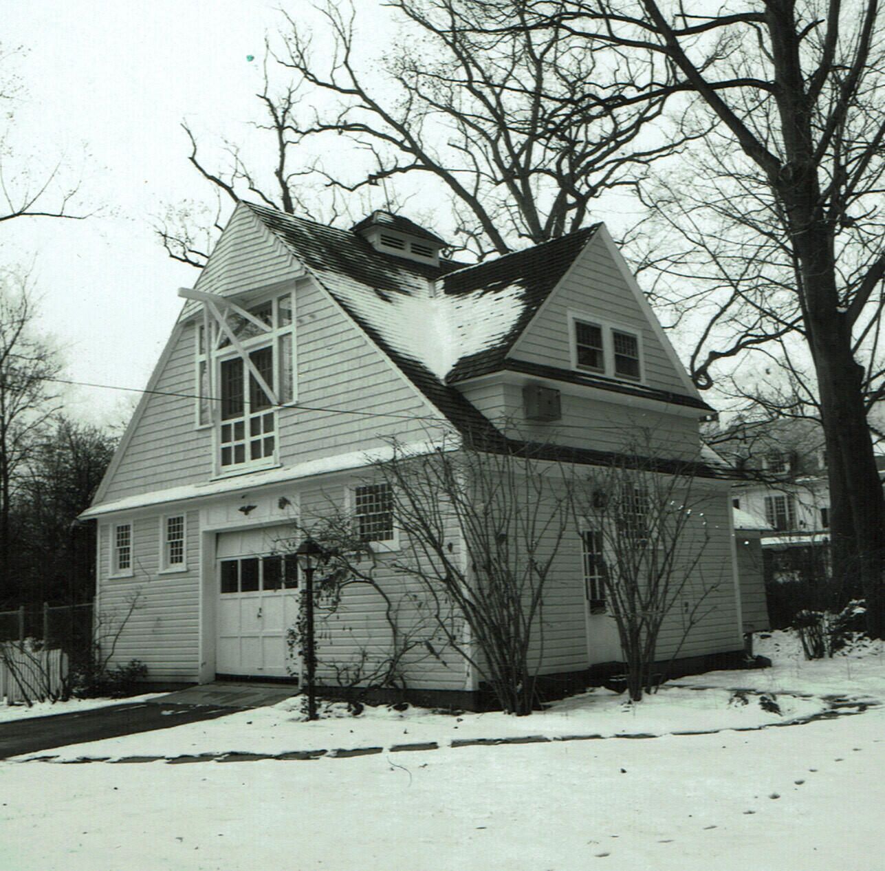 Photograph of 109 Forest Drive. Hartshorn House # 35. Built in ca. 1909. Eclectic style with hop roof and wood shingles; exterior finish is stucco. Note oval windows next to entrance. Entrance door with matching French doors on either side on ground floor. Small window panes. The original house, which was designed by Frederick W. White, burned down in 1909. Original carriage house in rear yard. The barn is an excellent example of the shingle style.