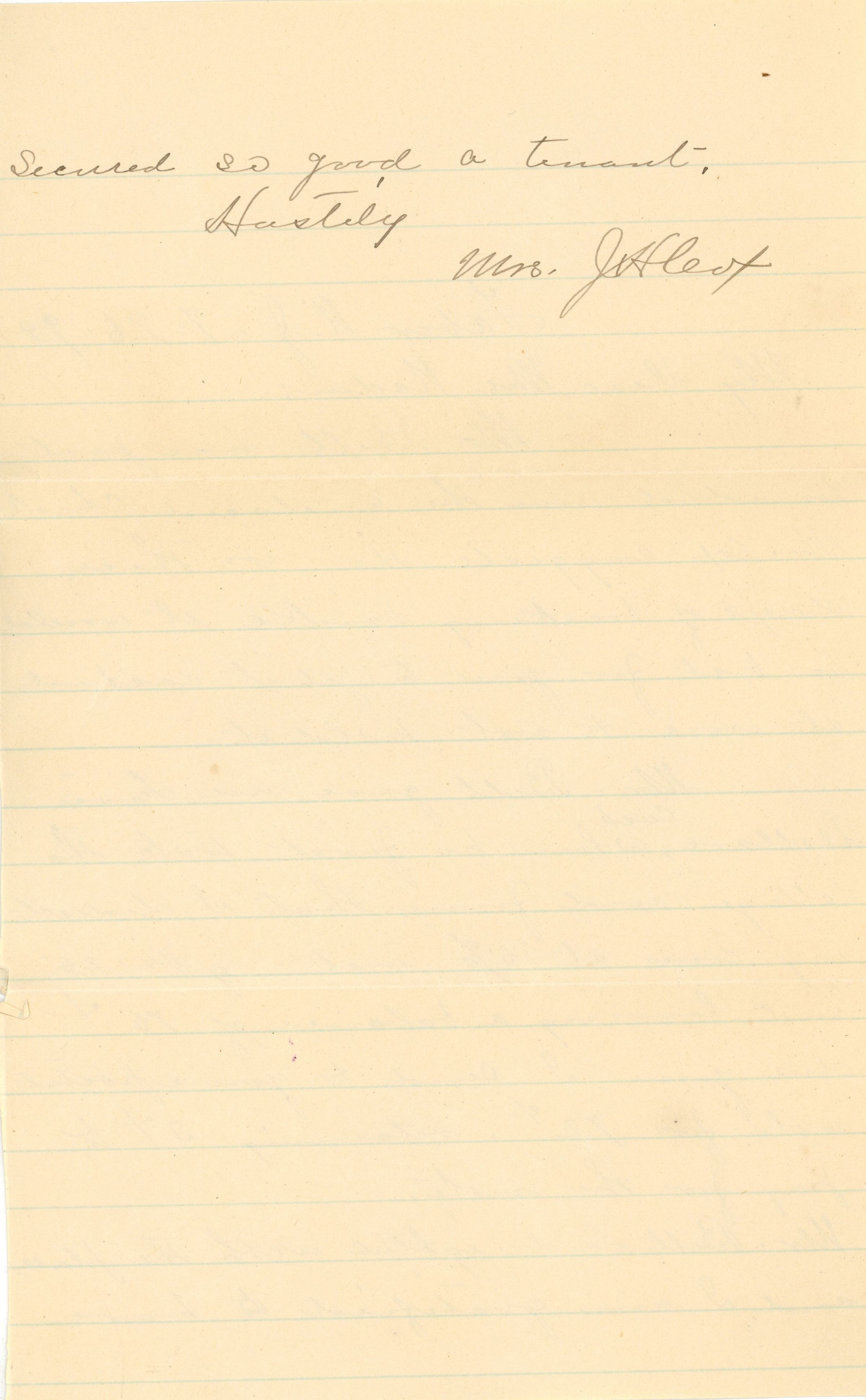 Mr. Bell gave me five dollars cash when he first took the cottage and from that I deducted my com at 5% making $4.25 an leaving a balance of 75 cents due you. I send to you a postal note for 72 cents, retaining 3 cents to pay for the note.