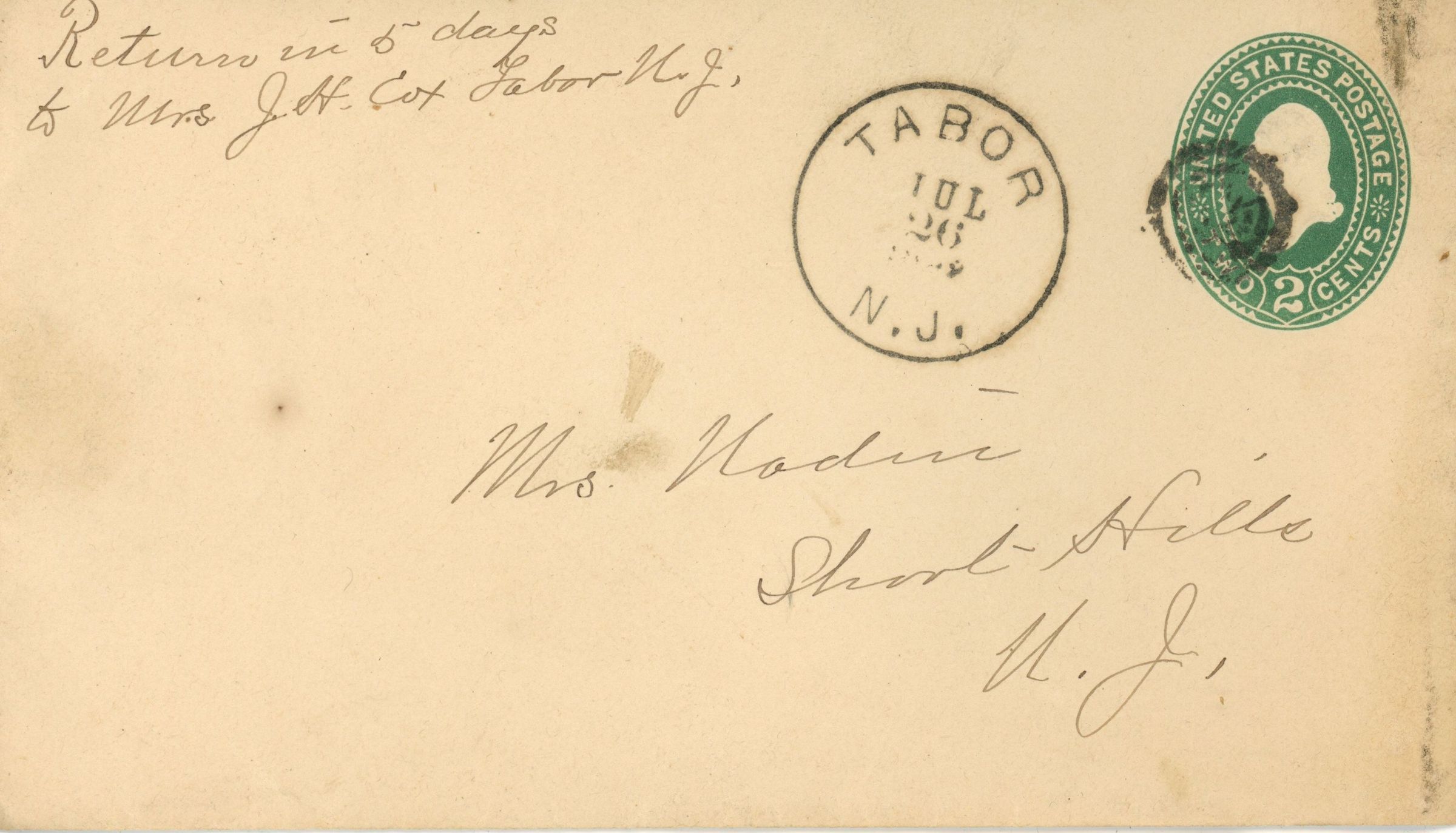 Two page letter and postally used envelope from Mrs. J.H. Cox, Tabor, NJ to Mrs. Mary Nadin, Short Hills from Tabor, NJ. dated July 26, 1893. The letter reads as follows:
