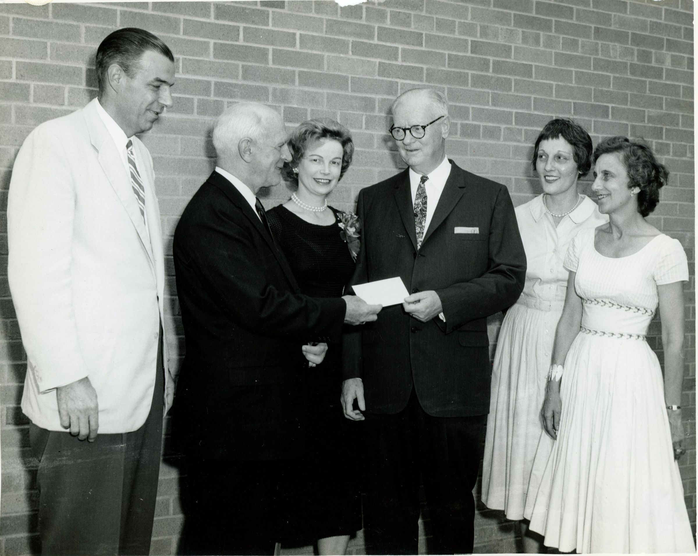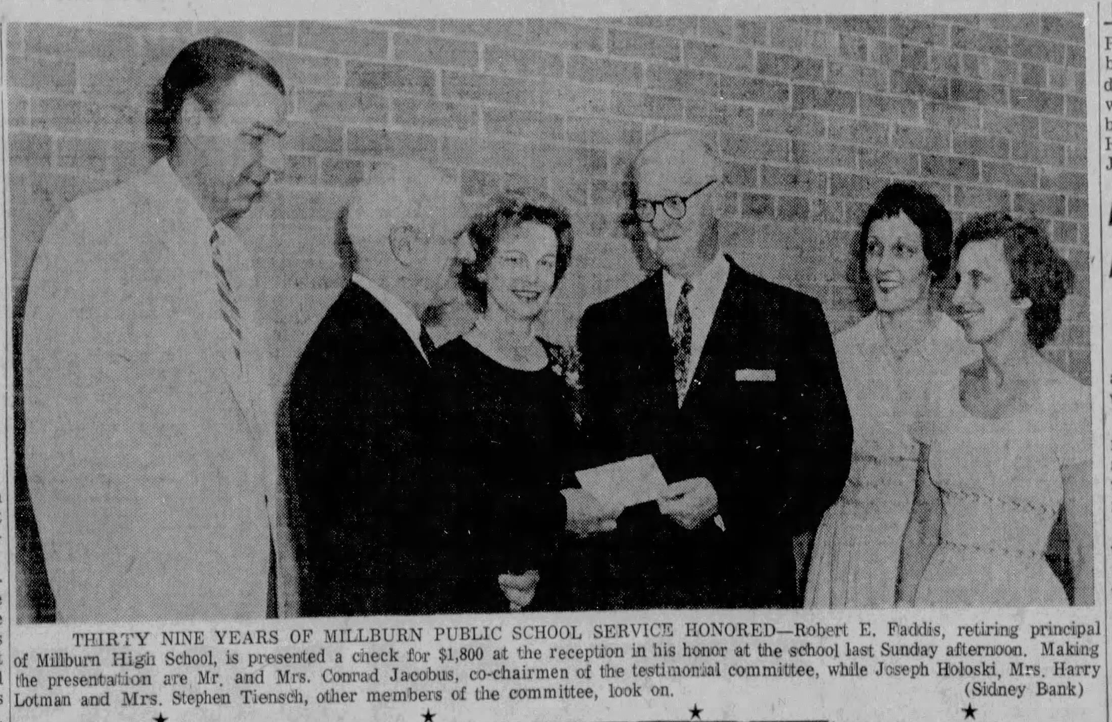 Photograph of Millburn High School Principal receiving a check for $1,800 in recognition for his 37 years of service in the Millburn Public School District from the testimonial committee on during a reception in his honor of his retirement on June 18, 1961. Pictured in the photograph are: Mr. and Mrs. Conrad Jacobus (Committee Co-Chairs) making the presentation, Joseph Holoski, Mrs. Harry Lotman and Mrs. Stephen Tiensch. Note: The caption mistakenly reads 39 years.