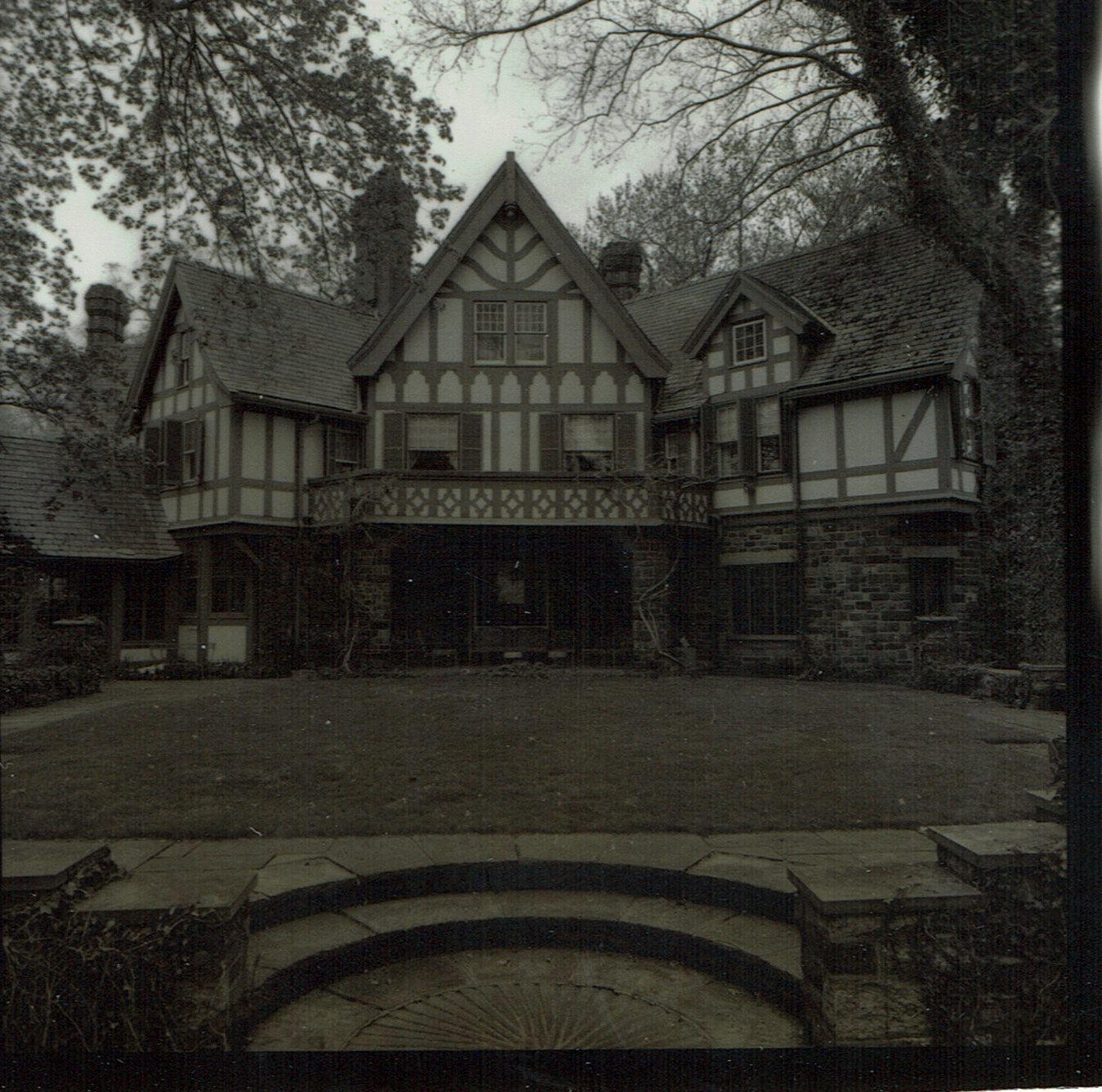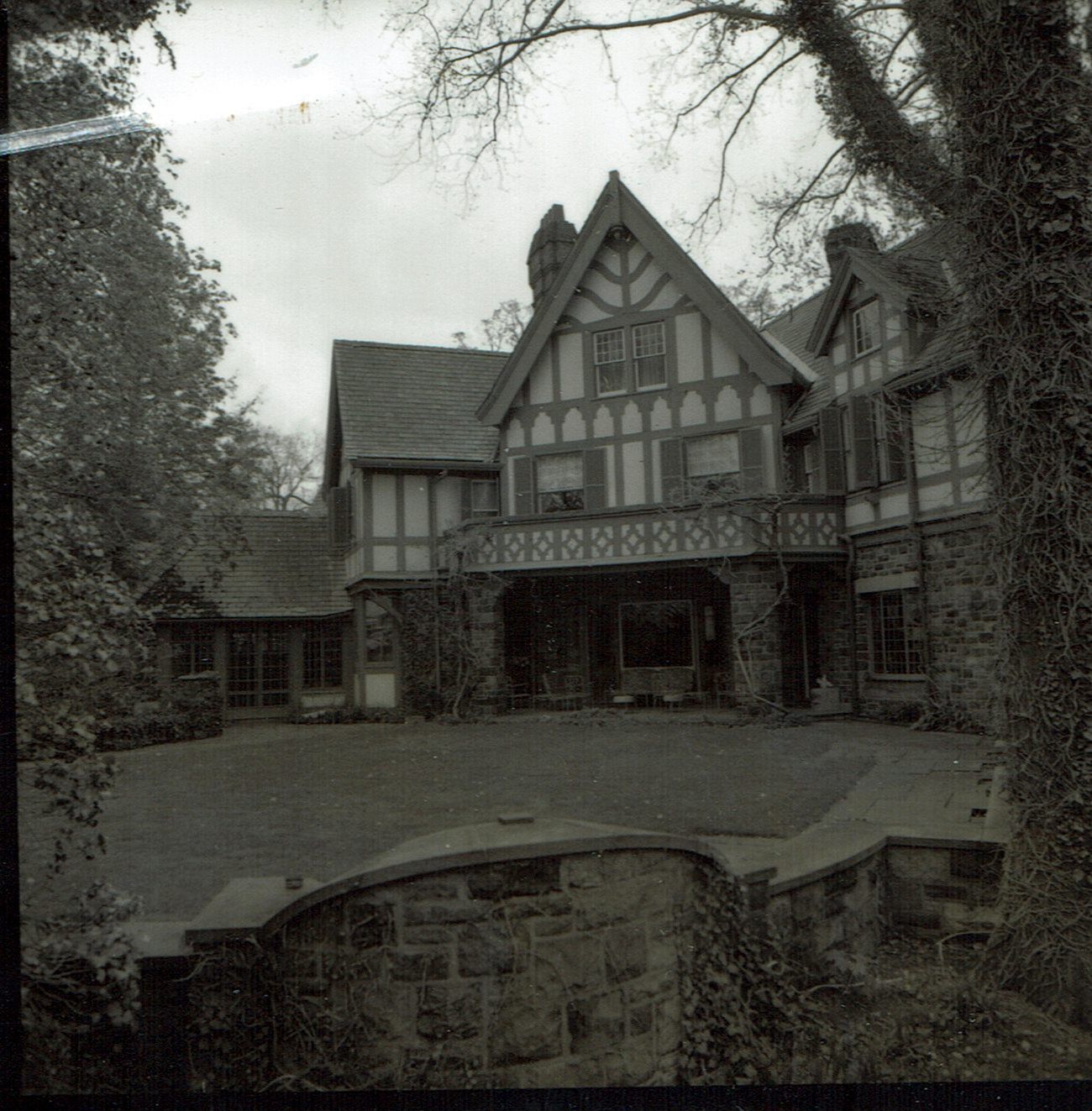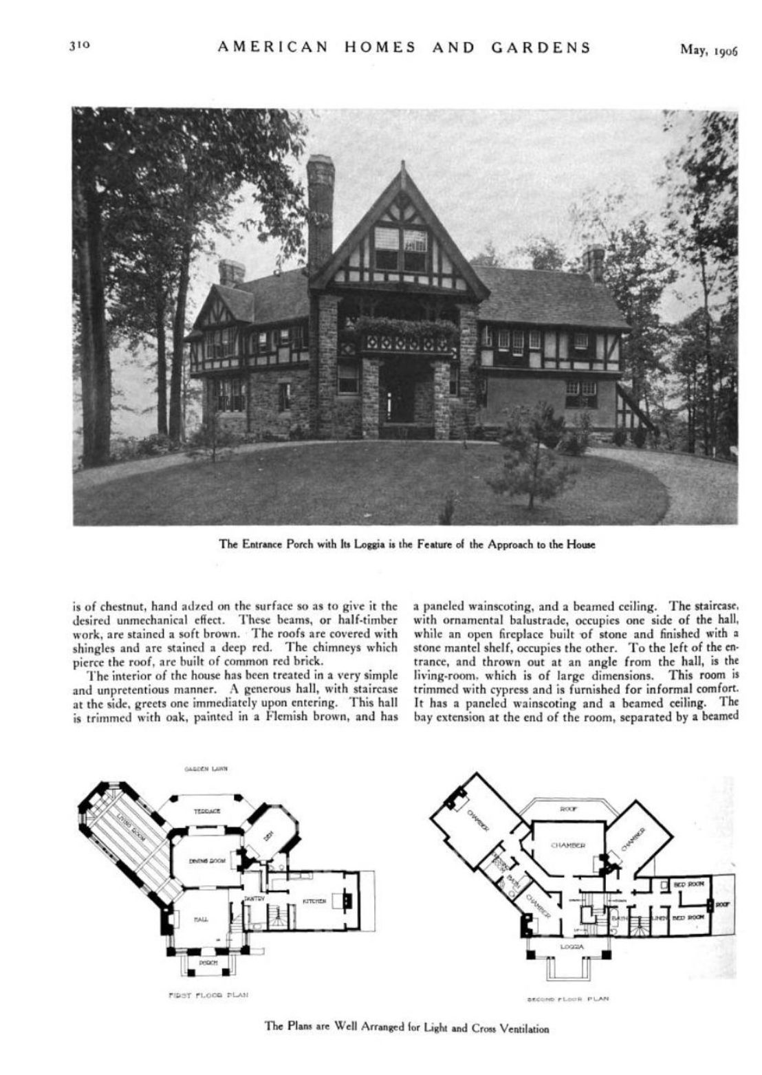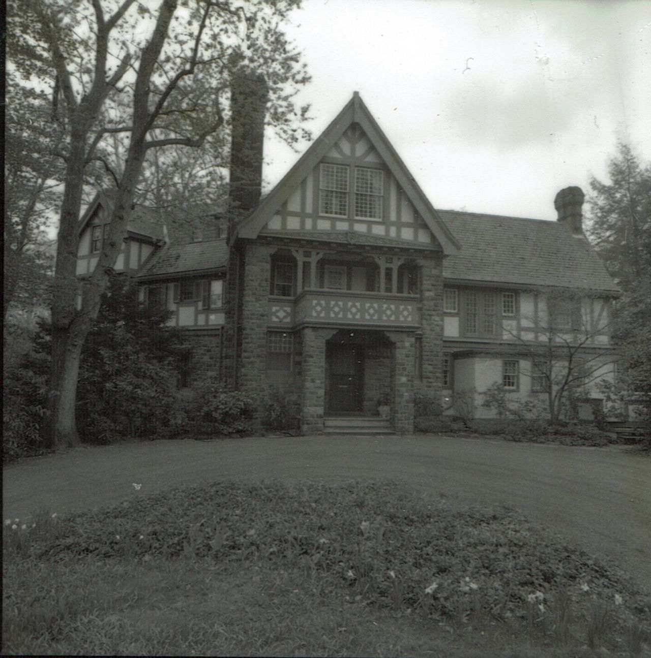 Charles H. Stout house built on one of the original Hartshorn Estate Inc. properties in the English Tudor style. The house was later owned by Admiral Albert G. Mumma. Architects Wainright Parish and James Langdon Schroeder make extensive use of "strapwork," and ornament particular to Medieval Revival style. Here it appears over the front entrance. It consists of decorative wood scrollwork that somewhat resembles leather straps and contrasts with the half-timbering of the gable. Henrietta Stout was a well known horticulturalist, famous for her dahlias. Her brother, James Langdon Schroeder, was the architect of the house.