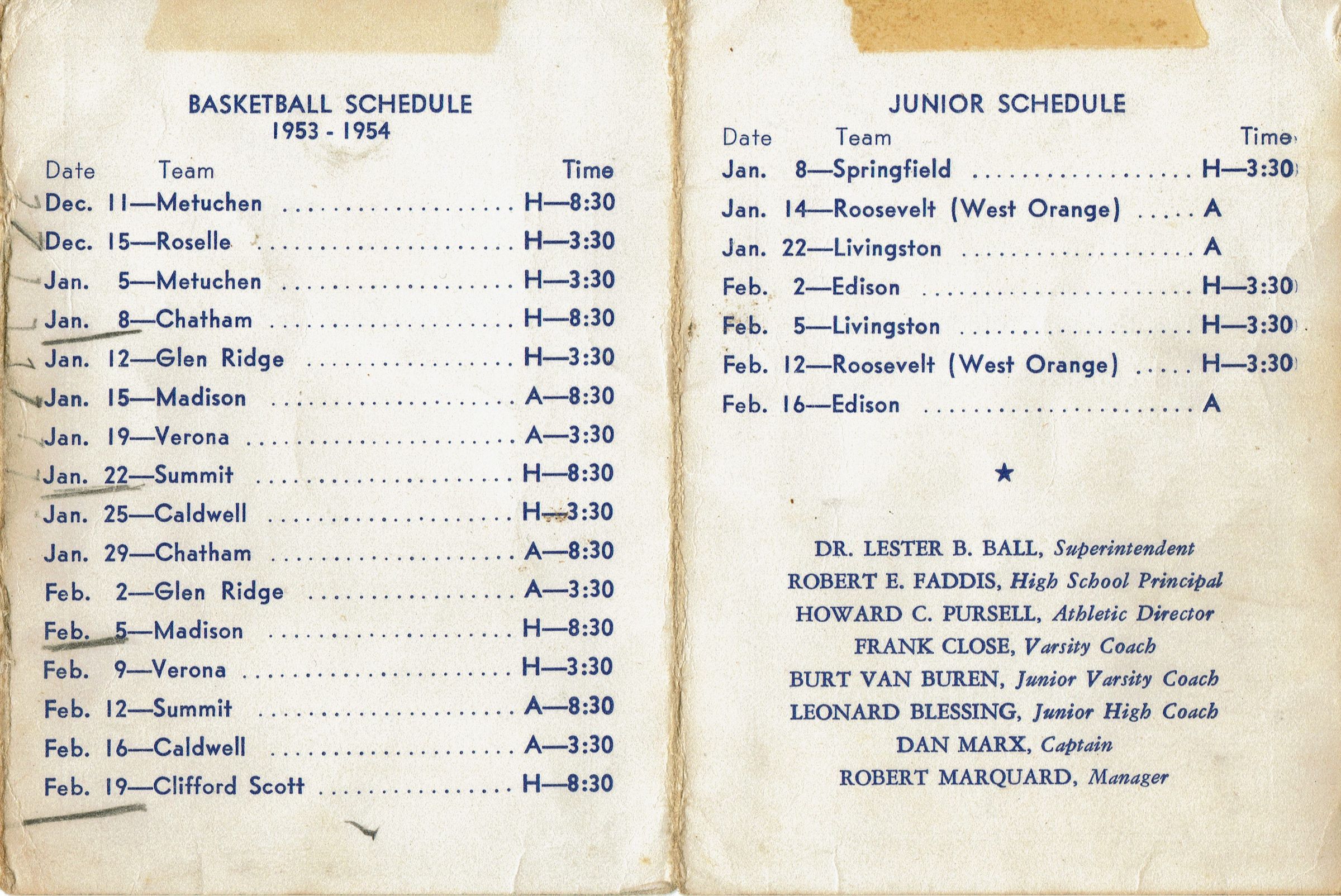 Millburn High School Basketball Schedule, 1953-4. 4 pp. Contains schedule for Varsity and Junior Varsity Teams. Advertisement for The Investors Savings and Loan Association, 64 Main Street on back cover. Dr. Lester B. Ball (Superintendent), Robert E. Faddis (High School Principal), Howard C. Pursell (Athletic Director), Frank Close (Varsity Coach), Burt Van Buren (Junior Varsity Coach), Leonard Blessing (Junior High Coach), Dan Marx (Captain), Robert Marquand (Manager).