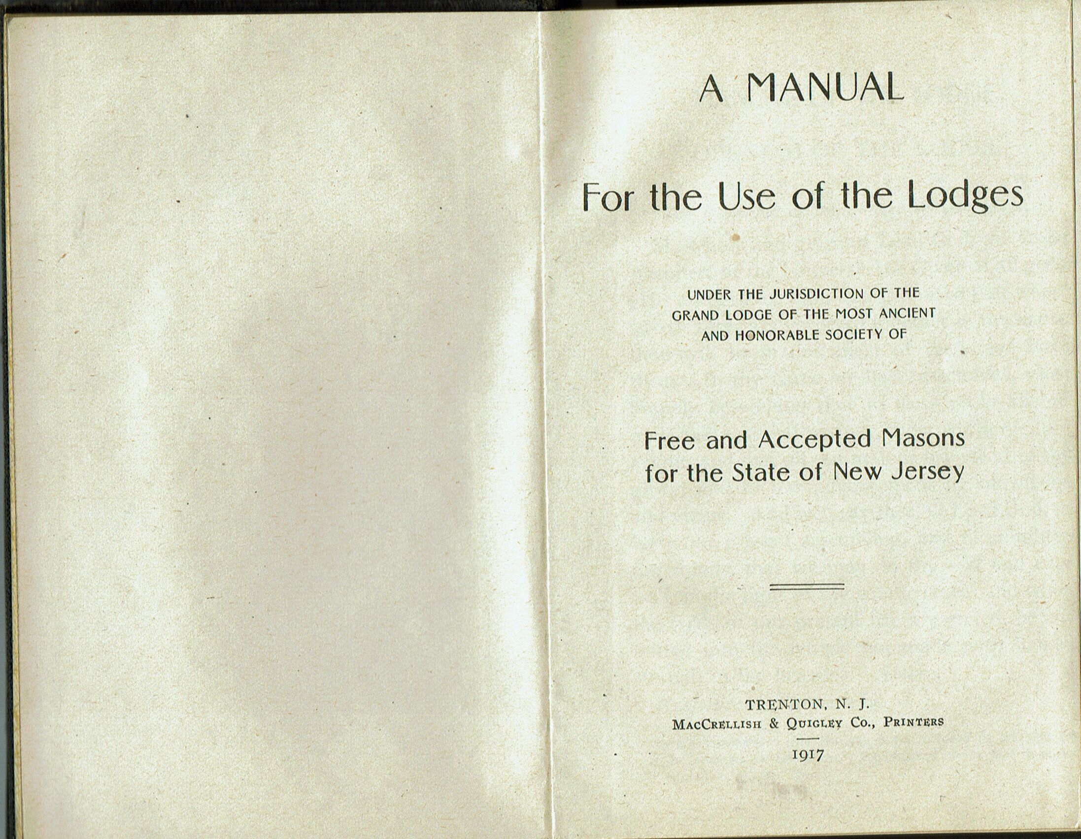 Stewart Hartshorn's Copy of "A Manual for the Use of the Lodges Under the Jurisdiction of the Grand Lodge of the Most Ancient and Honorable Society of Free and Accepted Masons for the State of New Jersey," published in 1917. Contains Stewart Hartshorn's Book Plate on the first past down page and in a leather covering. Contains a copy of the Principles and Purposes of Freemasonry: Grand Jurisdiction of the State of New Jersey 4 page pamphlet.