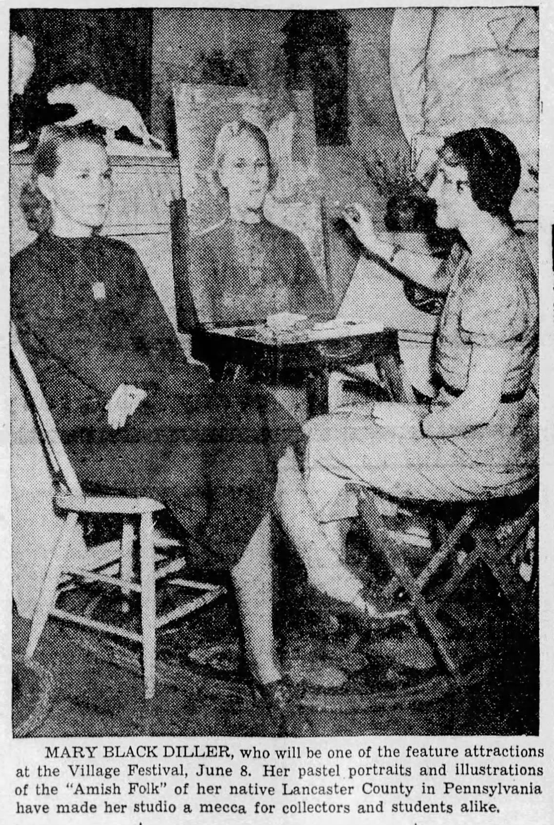 One of three photographs of painter Mary Black Diller in the Art Center Scrapbook. Diller was a guest artist at the June 1946 Village Festival sponsored by the Millburn Art Center. This photograph was featured in the May 30, 1946 edition of The Item of Millburn and Short Hills. She was known as a "Painter of the Amish People" in Lancaster Pennsylvania and the author of "Drawing for Children."
