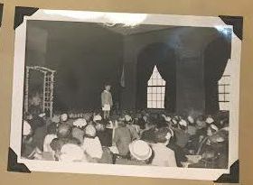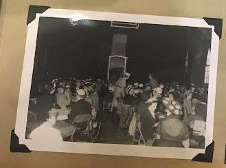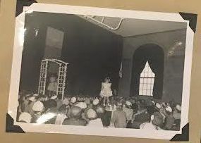 Black and white photographs of the PTA Fashion Show. Students are modelling outfits on a runway in front of the parents.