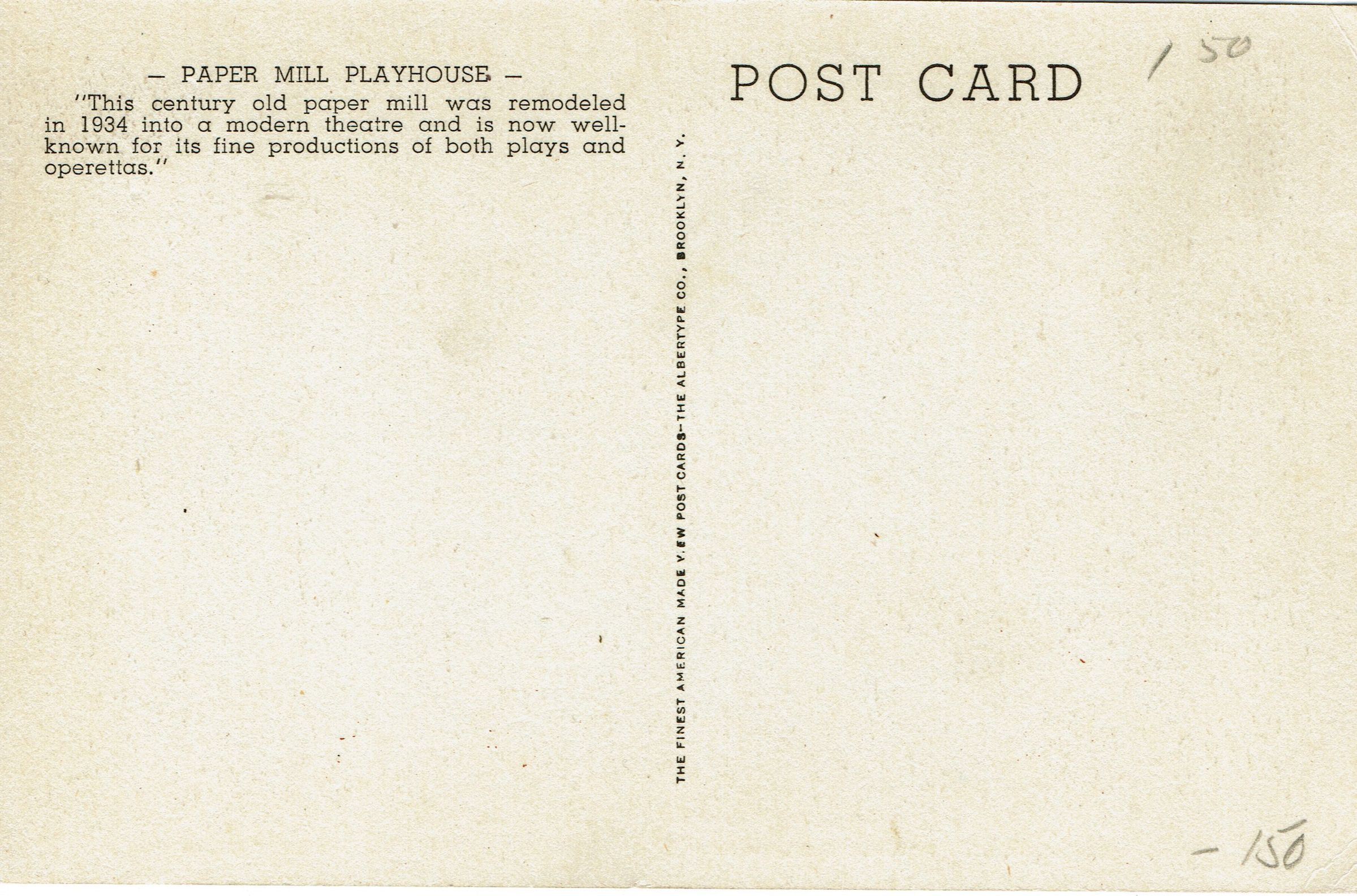 Postally unused, b&w photographic postcard of the wishing well, outside the Paper Mill Playhouse on Brookside Drive in Millburn, NJ. Multiple copies in the collection.