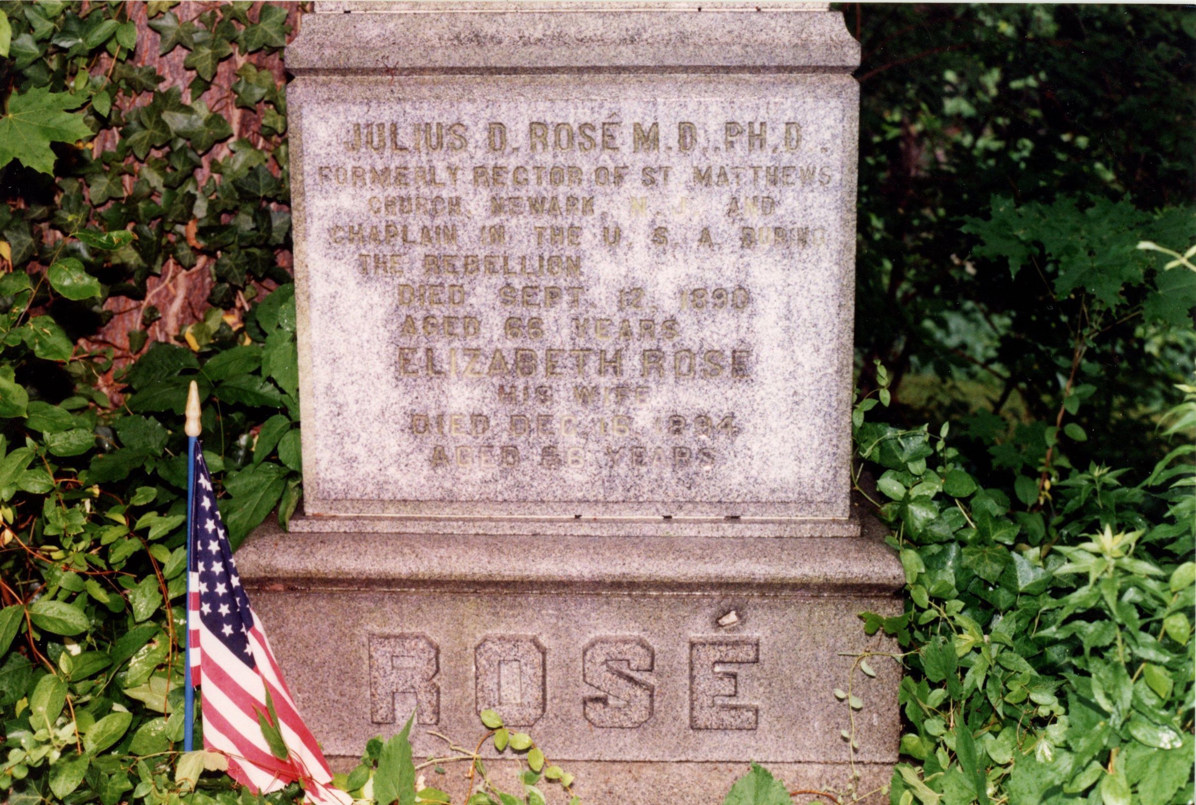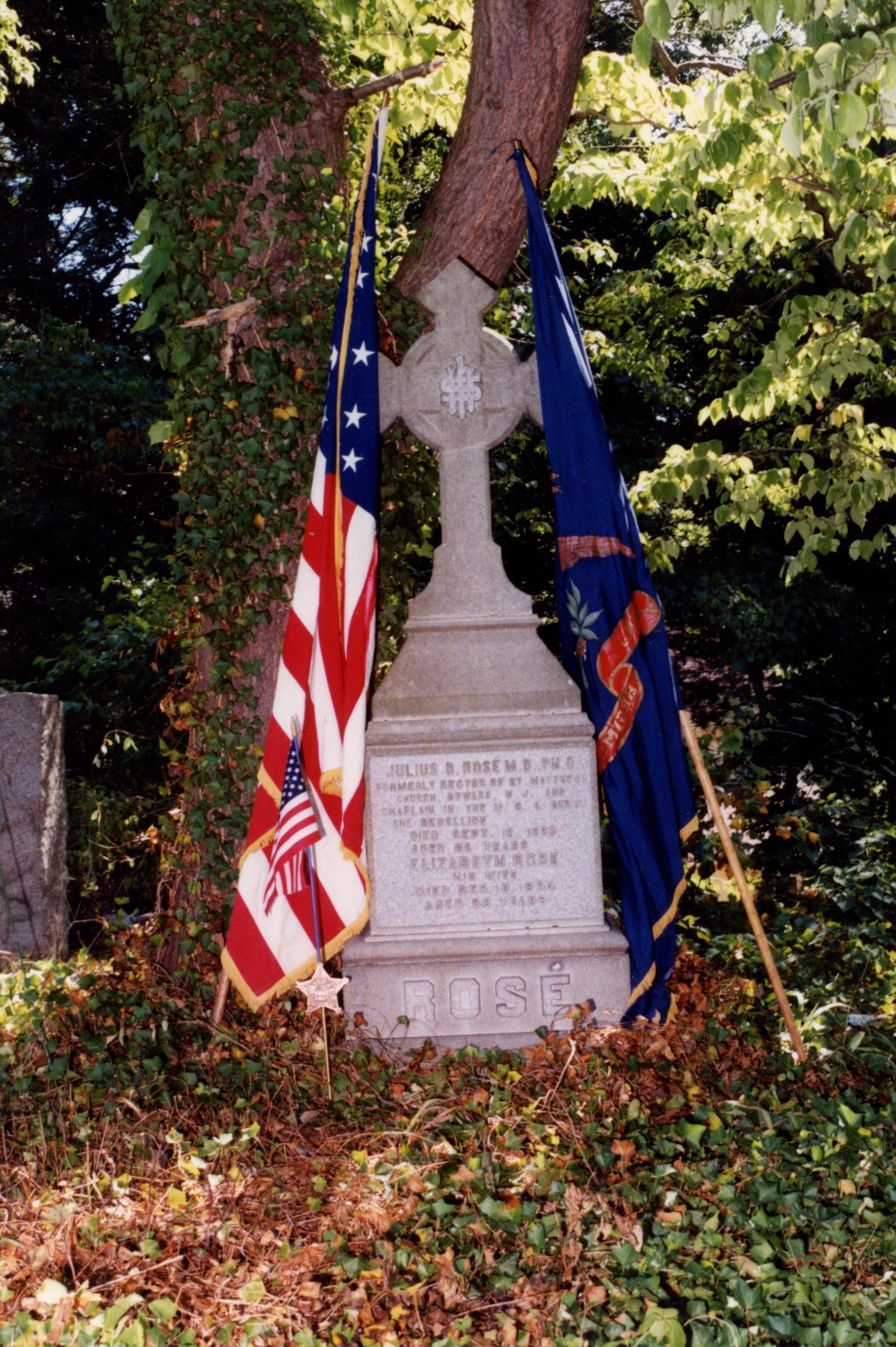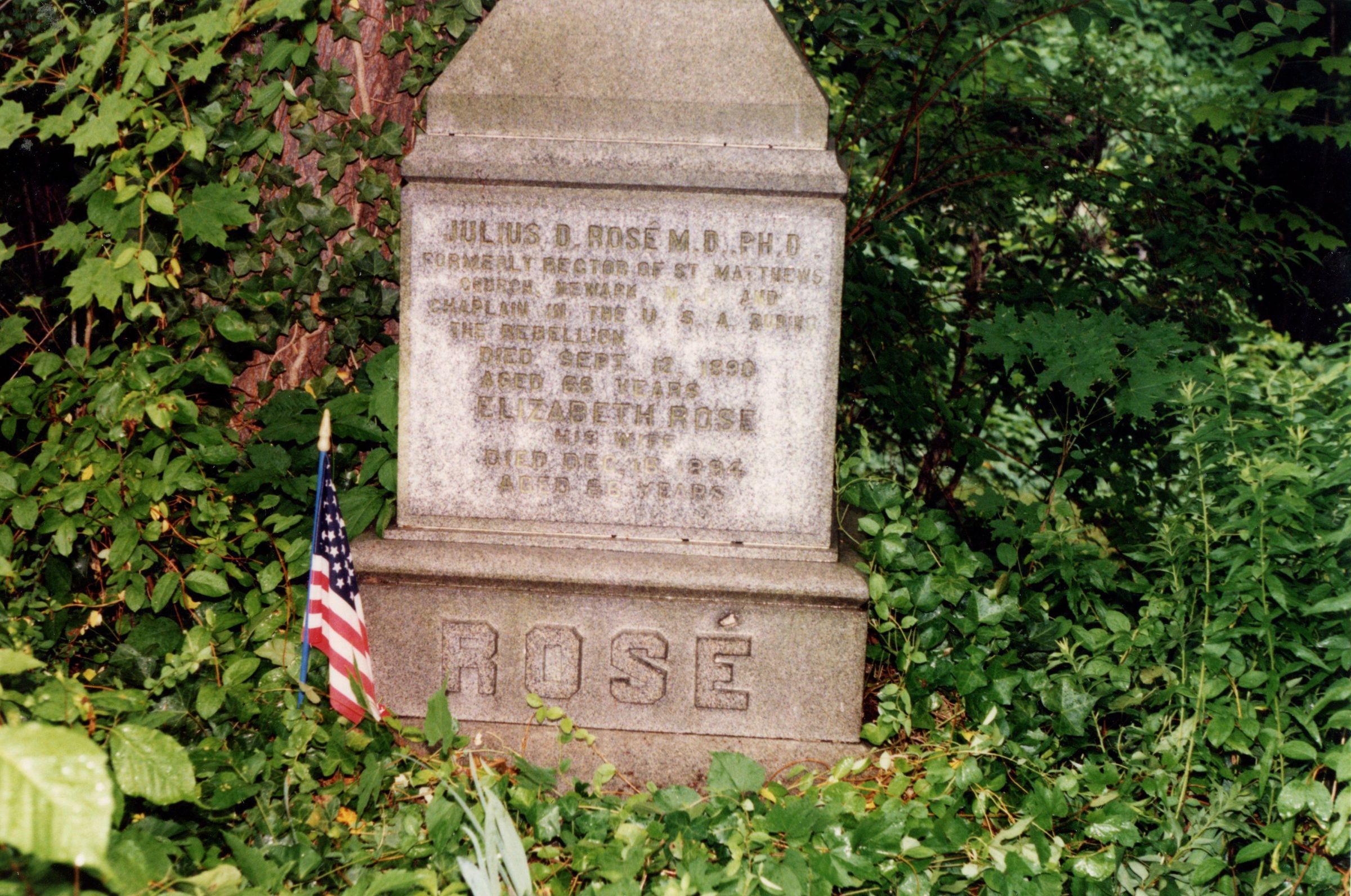 Photographs of Reverend Julius David Julius Rosé's gravestone at St. Stephen's cemetery taken during the Memorial Service on August 7, 1999, honoring the Reverend Julius David, Chaplain of the 7th Regiment New Jersey Volunteer Infantry and founder of "The Mountain School" in Millburn.