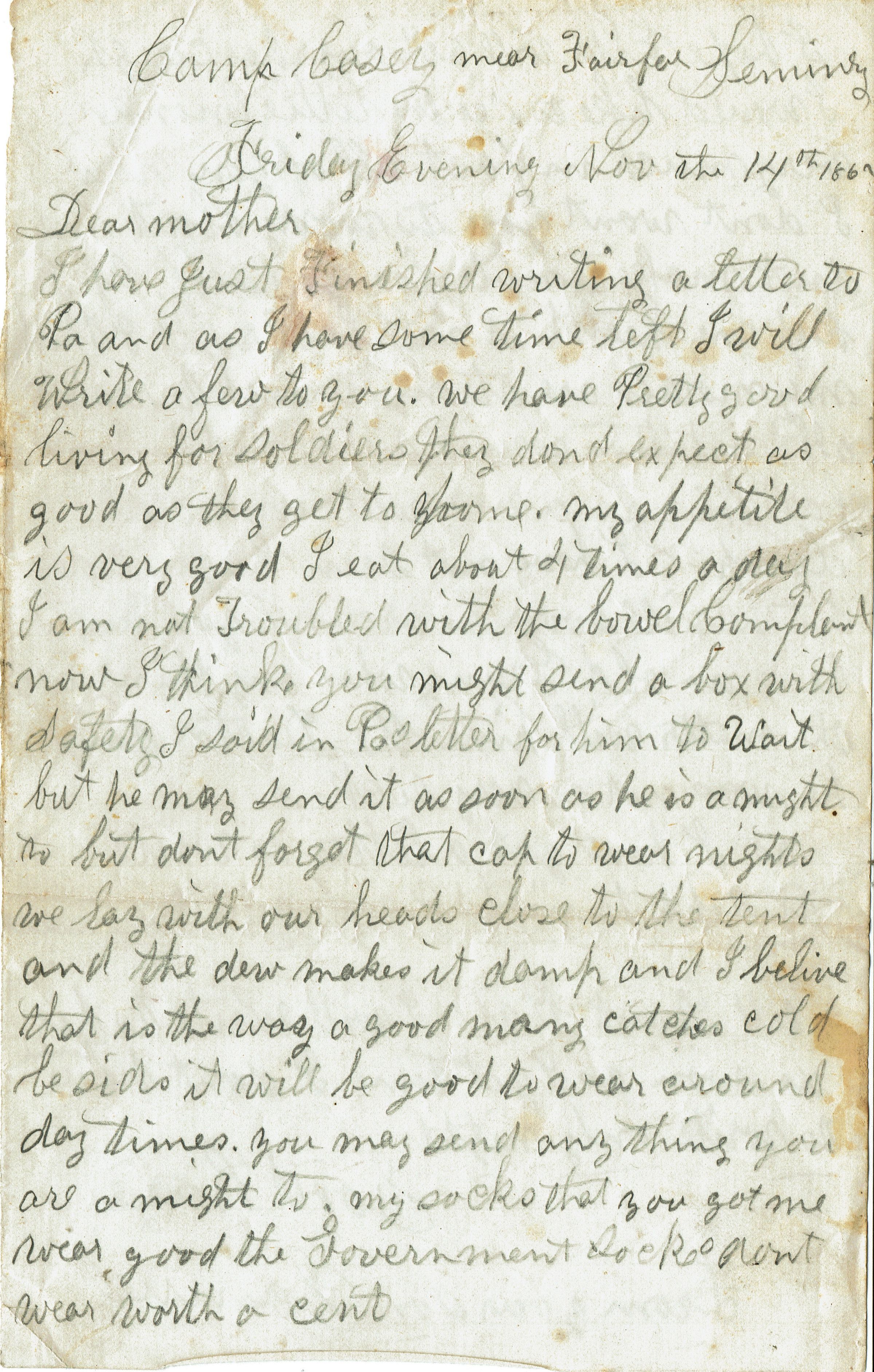 Letter from Samuel B. Parsil to his mother dated November 14, 1862, written from Camp Casey, near Fairfax Seminary, while he was serving with the 27th NJ Infantry.