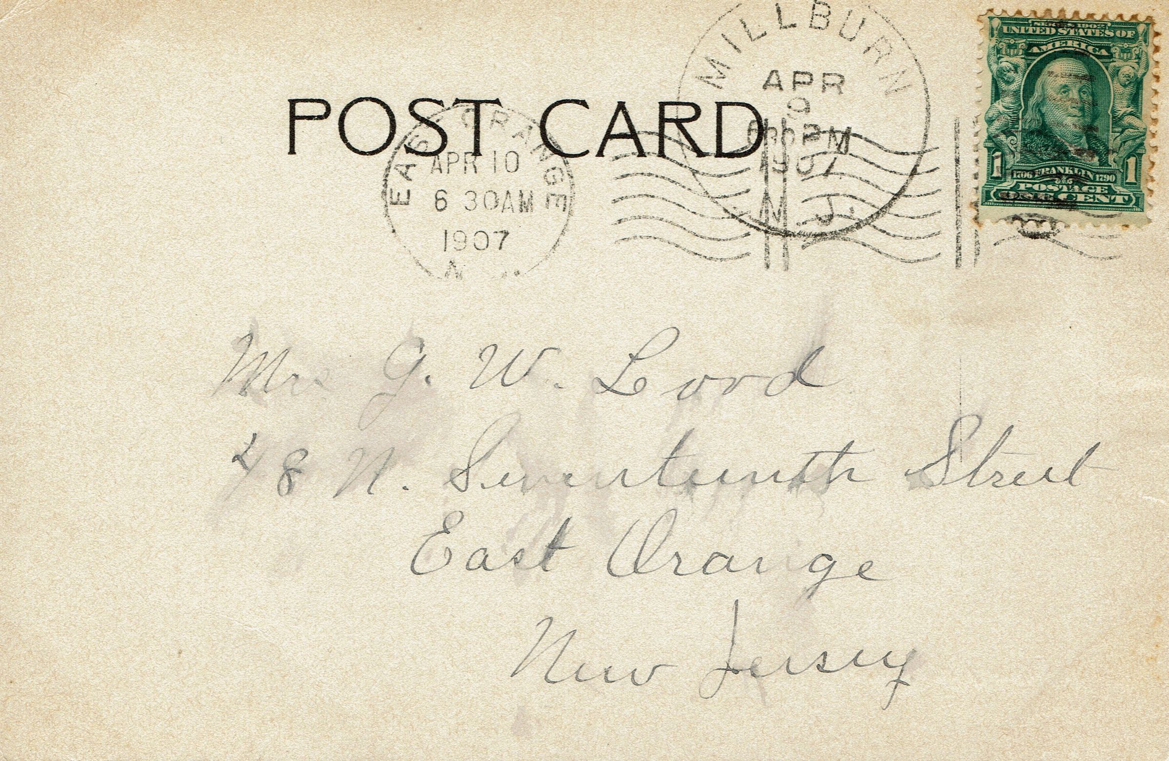 Photographic postcard of "The Quarry, Millburn, NJ" showing the Lighthipe quarry at the south end of South Mountain (Newark Mountain). Postally used, postmarked Millburn, April 9, 1907, 6:30 pm and received East Orange, April 10, 1907, 6:30 pm. Message inscribed on the front of the card reads: "I think I better get them myself." Postcard is addressed to Mr. G.W. Lord, 48 North Seventeenth Street, East Orange, NJ.