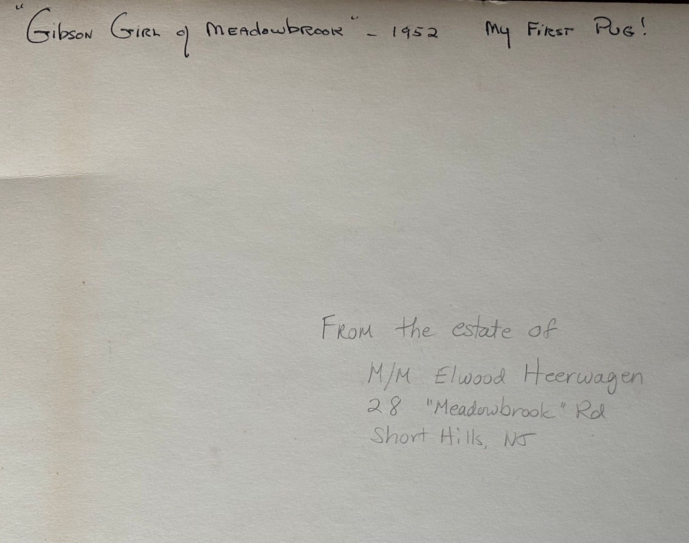 Large Black and White photograph of Mr. and Mrs. Elwood Heerwagen's prized pug. Contains inscription on verso: "The Gibson Girl of Meadowbrook," 1952. The Heerwagen's lived at 28 Meadowbrook Road, Short Hills.