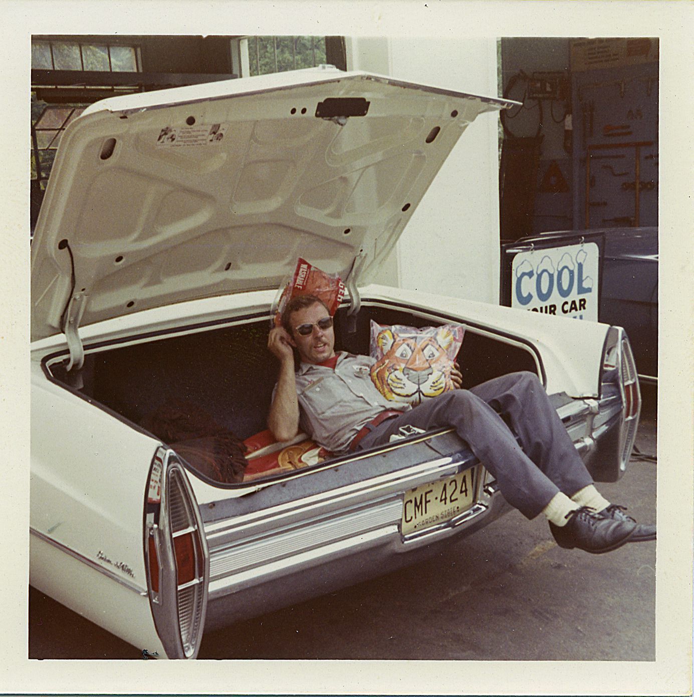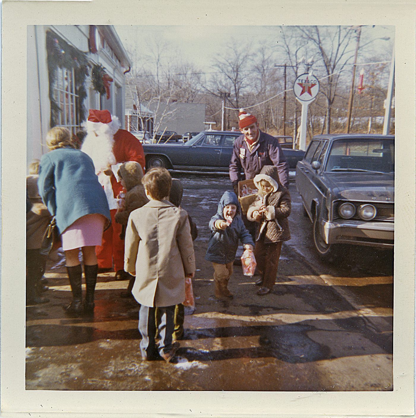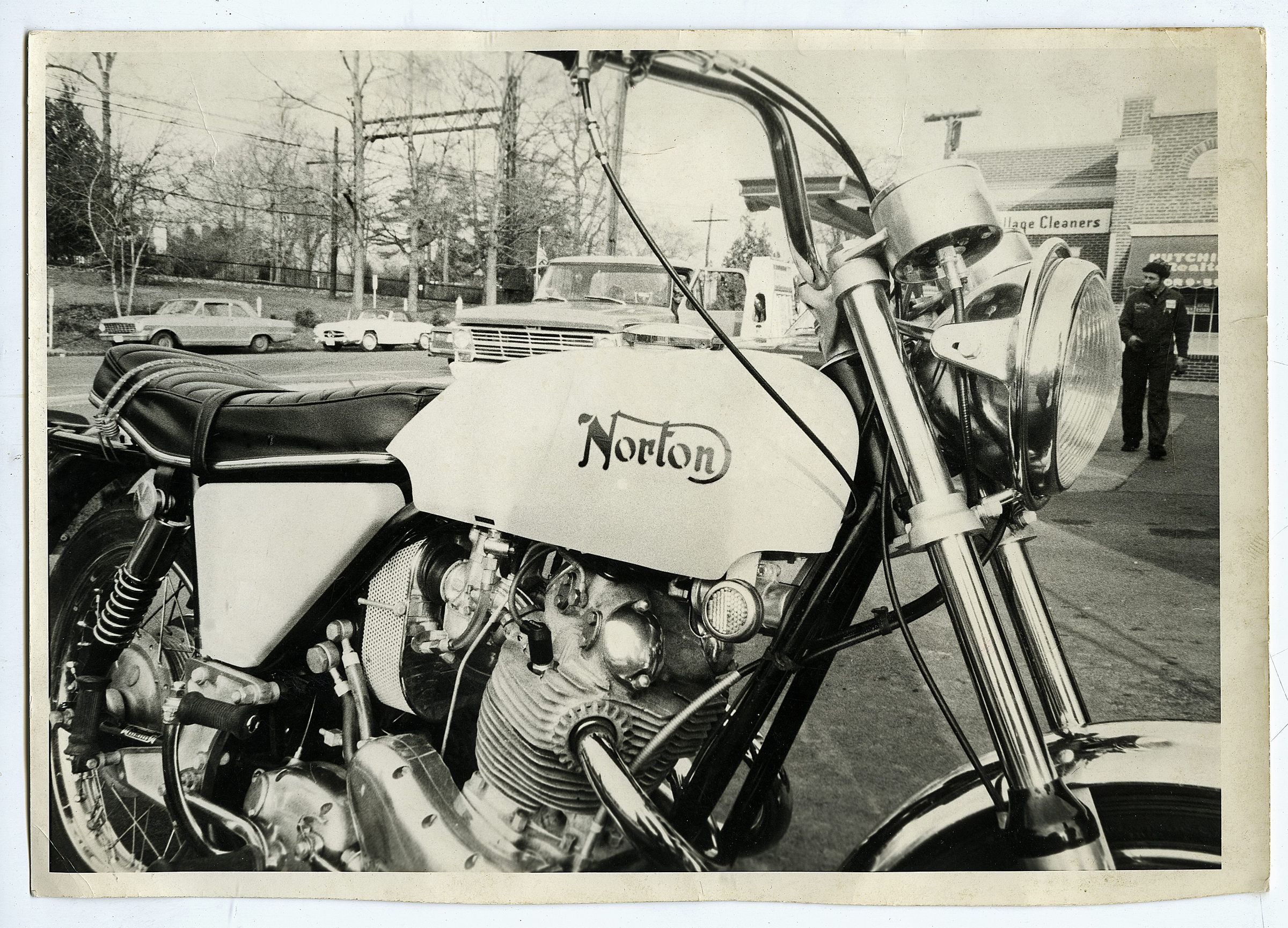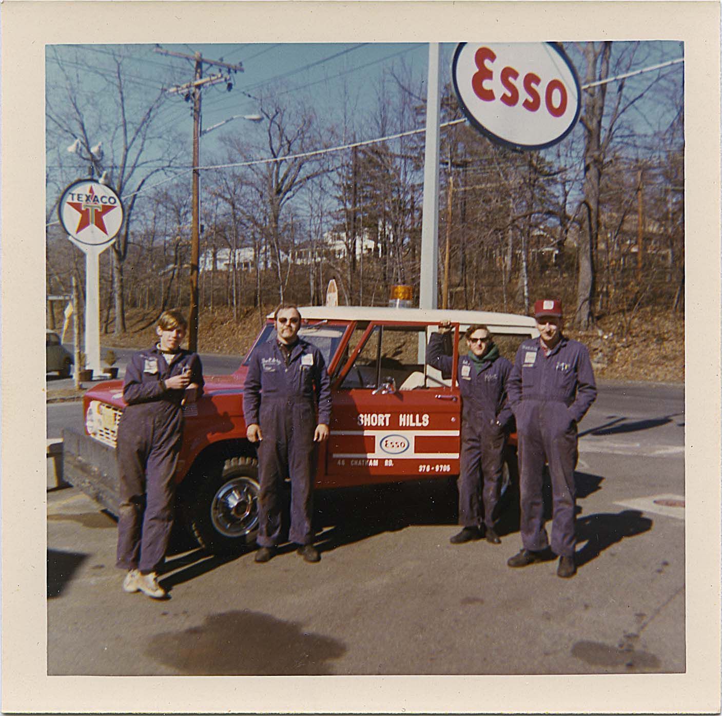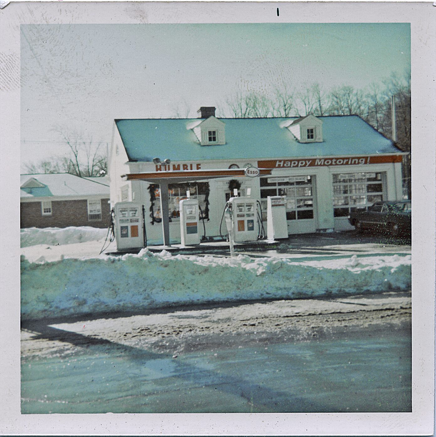 Photograph of Tom Schaefer and his motorcycle from the Esso Service Station on Chatham Road and other photographs of the station with customers including Santa visit to Chatham Road Stores.