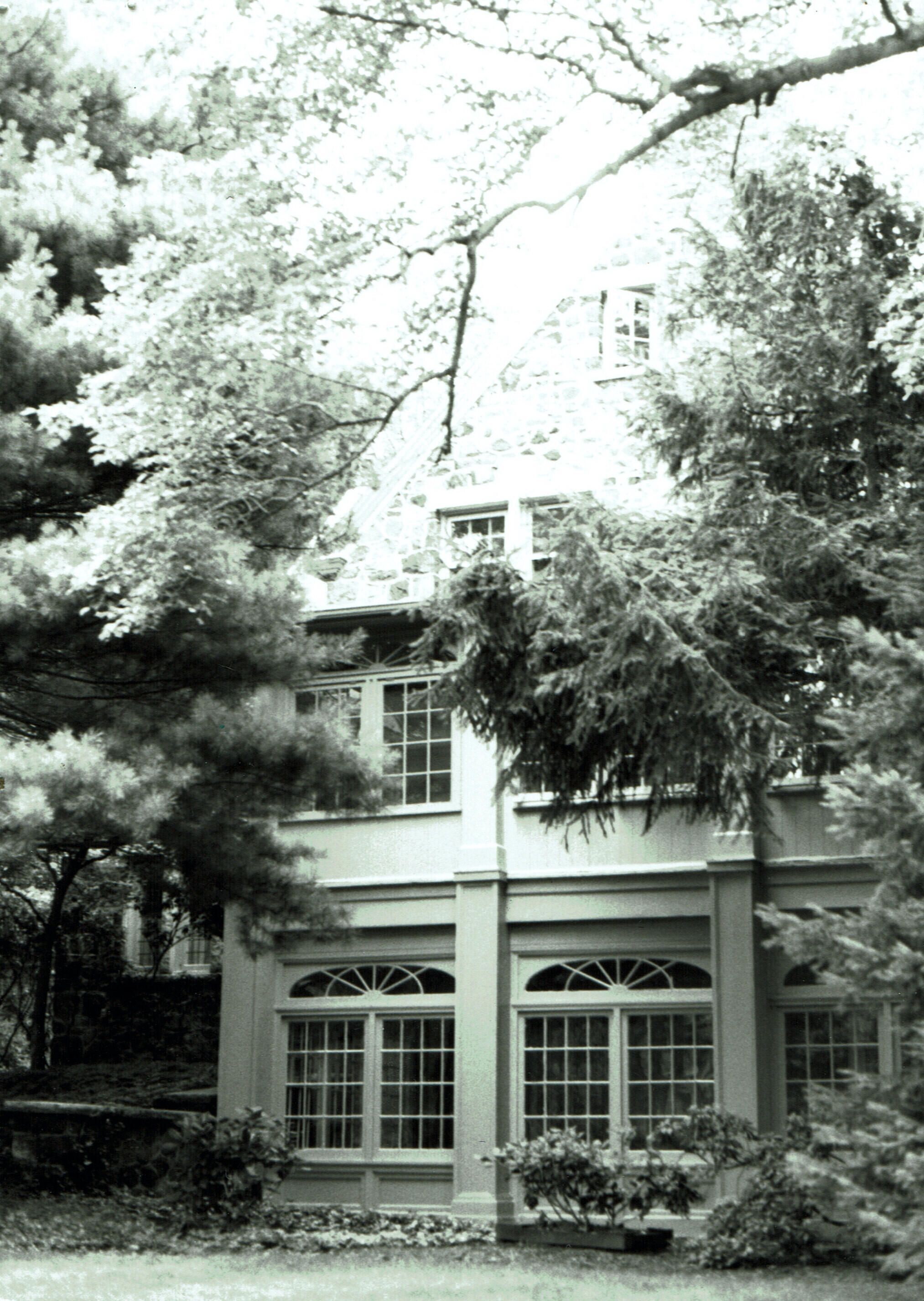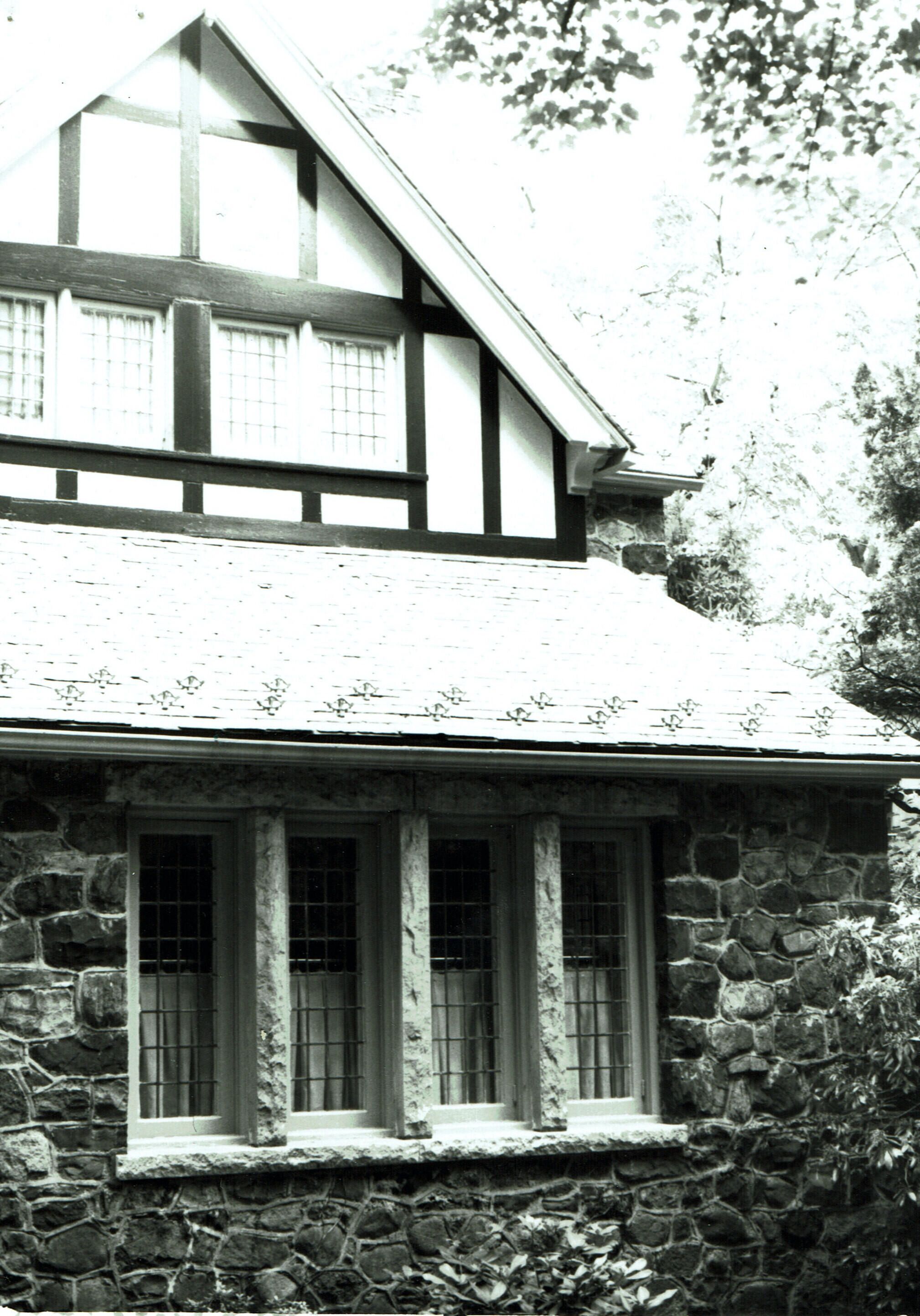 Hartshorn House #73 from 1912. Colonial Revival Style. According to the David Gibson historical sites survey, Stewart Hartshorn had this stone and stucco house built around 1912 and the first owner purchased it from him in 1915. Legend has it that Stewart Hartshorn kept his carriage in the ground level porch on the side of the home off the front lawn.