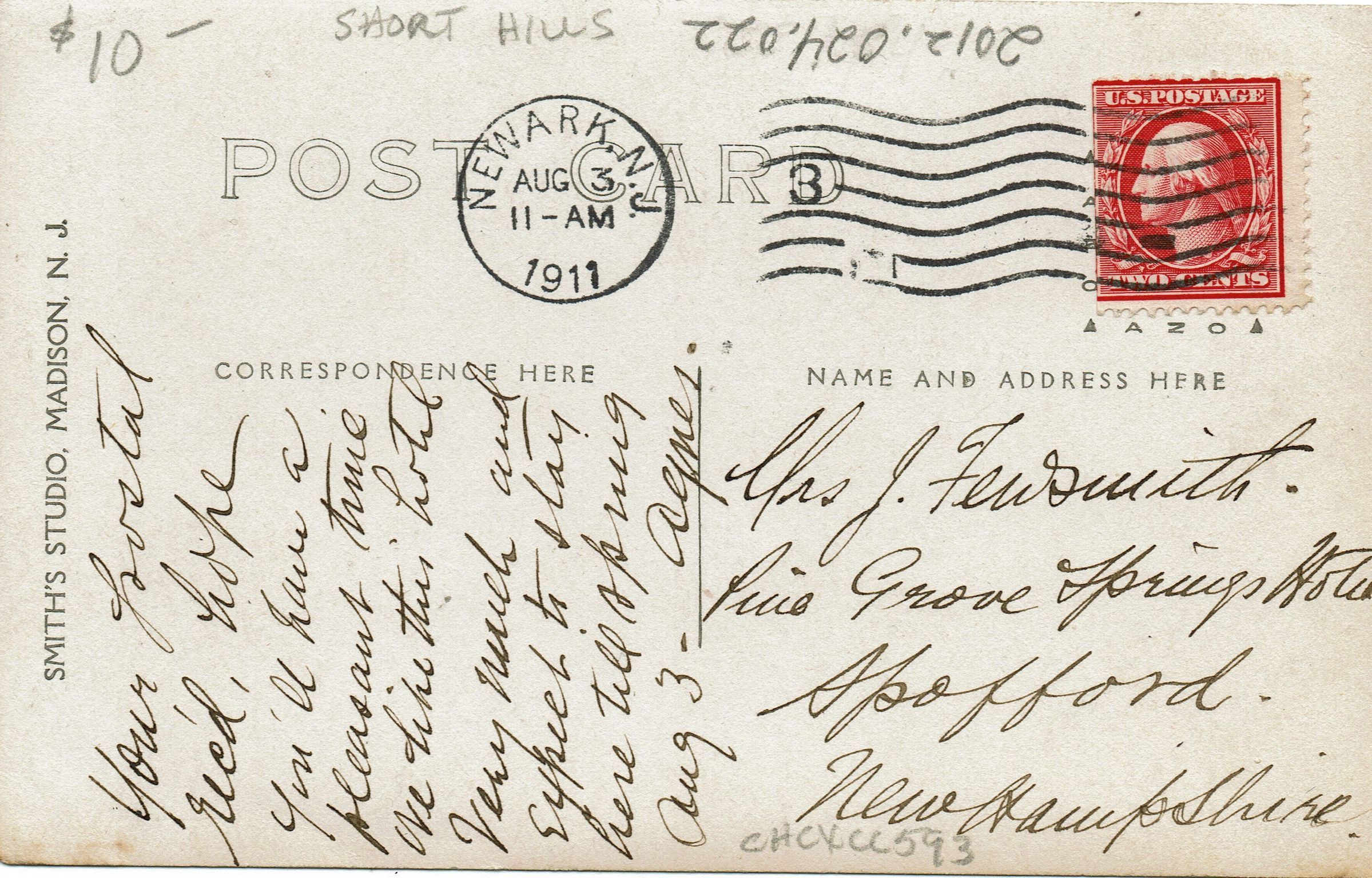 Postally used, photographic postcard of Short Hills home identified as Aunt Agnes' house. Postmarked Newark, NJ, August 3, 1911, 11:00 am. Card is addressed to Mrs. J. Fewsmith, Pine Grove Springs Hotel, Spofford, New Hampshire.