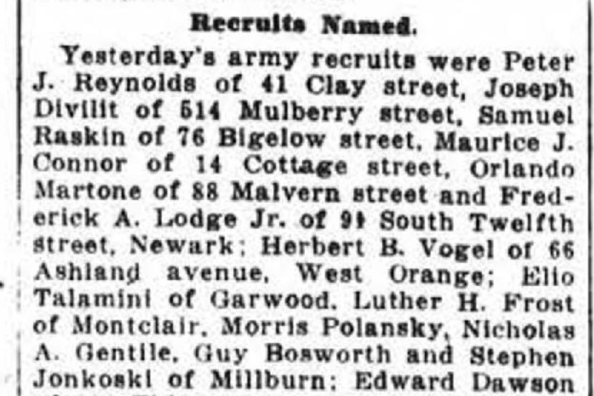 Guy R. Bosworth grew up at 45 Ocean Street, Millburn. In July 1912, he became certified as a Registered Pharmacy Assistant as of July 19, 1912. He enlisted in the army in May 1917 and was "reported killed " in the sinking of the transport Antilles on October 17 of that year. He was the first solider in New Jersey to die in WWI.