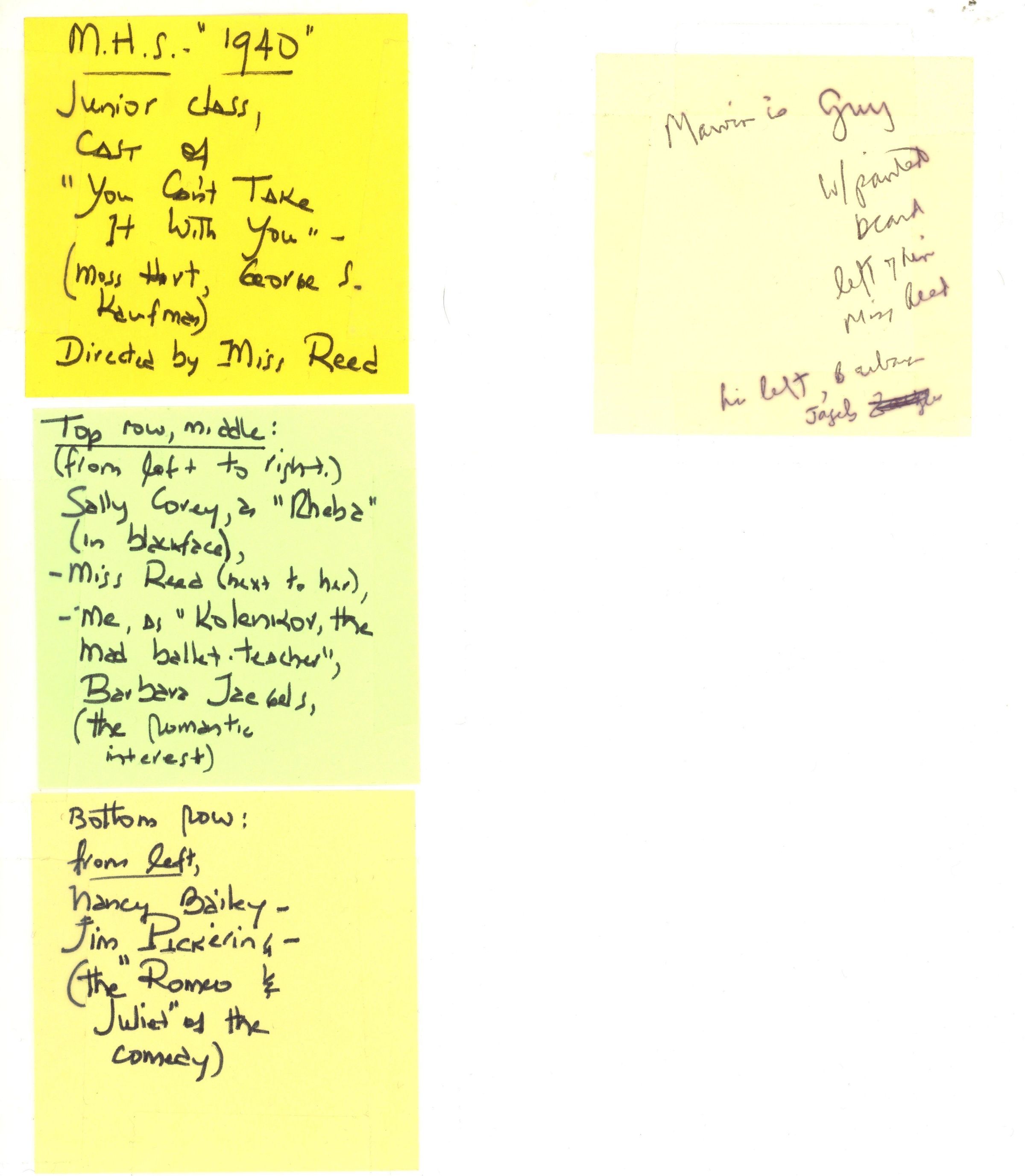 Signed photograph of the cast from the Millburn High School's Junior Class Production of "You Can't Take it With You," April 19, 1940. The production of Moss Hart and George S. Kaufman's "You Can't Take It With You" was directed by Miss Reed. Pictured in the photograph are: Top Row Middle: (from left to right) Sally Cory as "Rheba" (in blackface), Miss Reed," Marvin Silbersher as "Kolnekov, the mad ballet teacher," Barbara Jagels (the romantic interest).