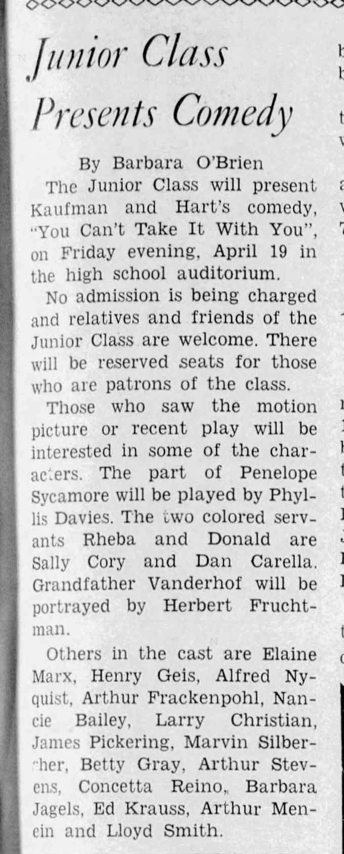 Millburn High School: You Can't Take It With You Cast, 1940
