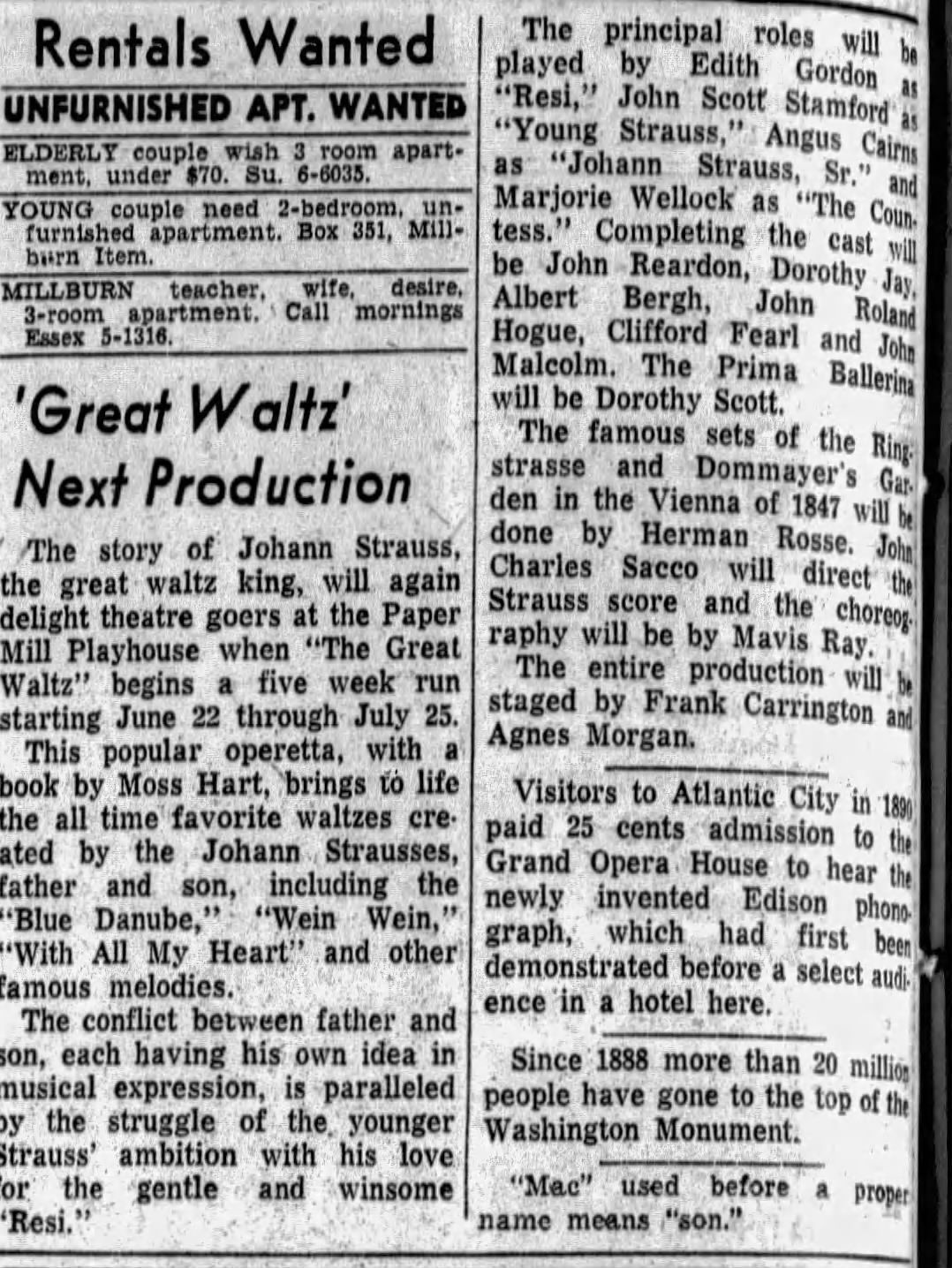 Paper Mill Playhouse Press Photo: The Great Waltz, 1954