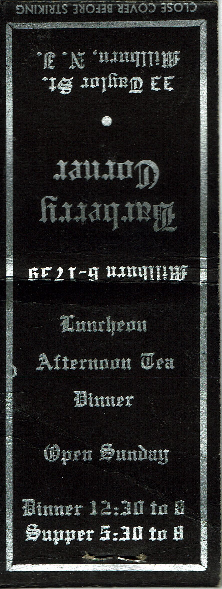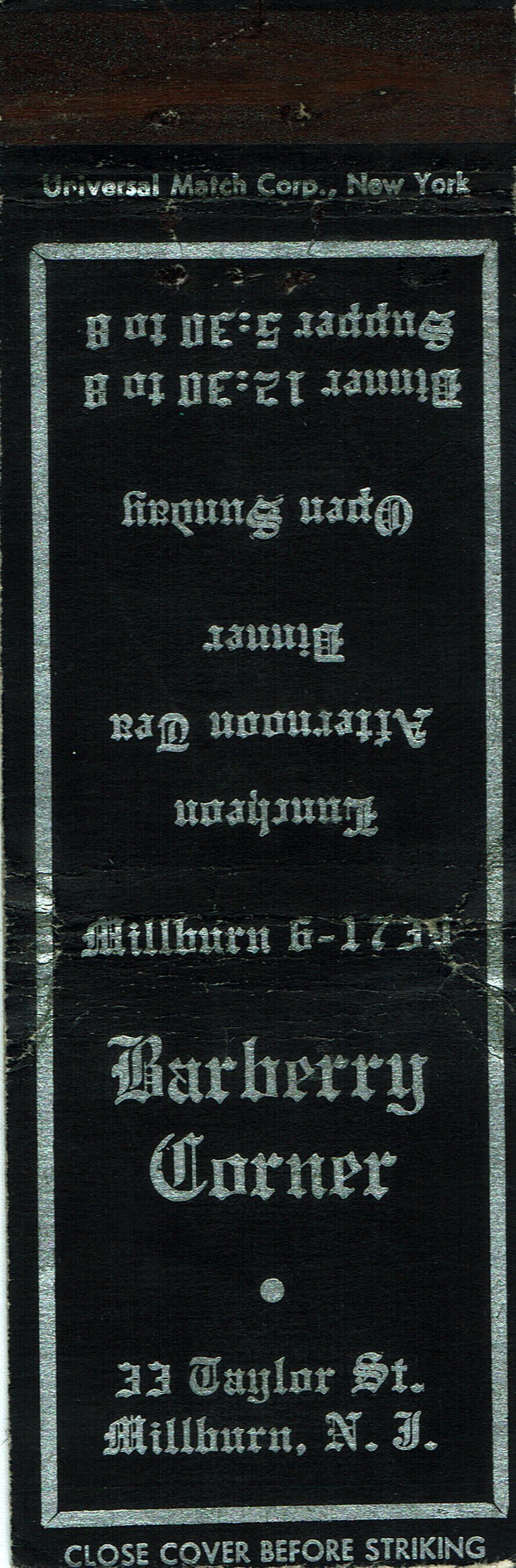 Matchbook Cover for Barberry Corner Restaurant, 33 Taylor Street, Millburn. Luncheon, Afternoon Tea, Dinner, Open Sunday. 2 copies.