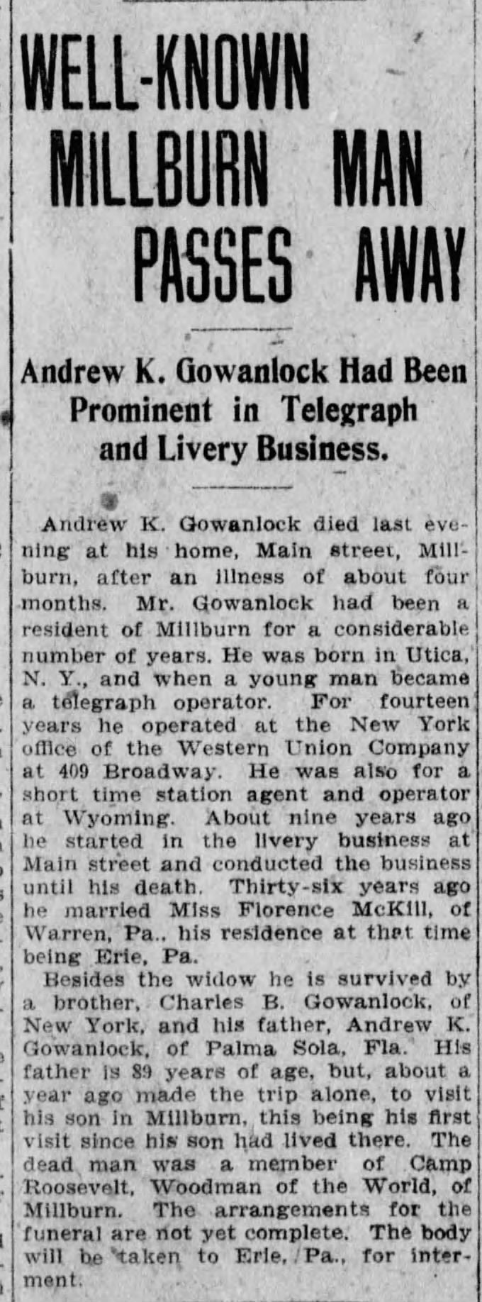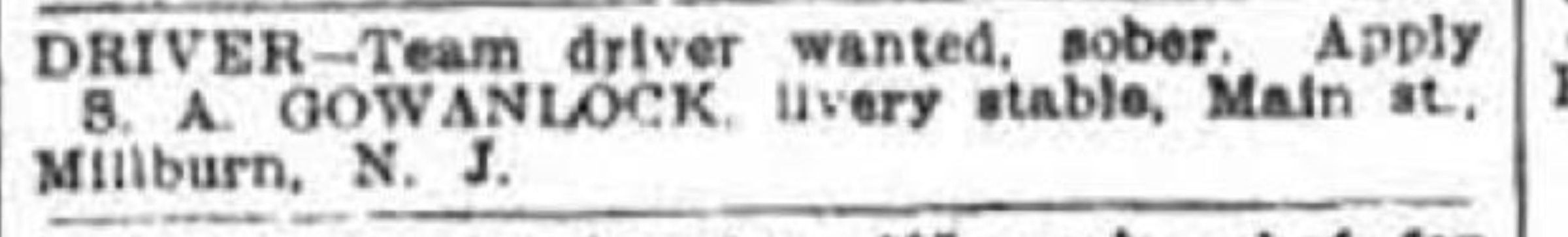 Photograph identified by inscription on verso as "Gowanlock's Livery" and donated by Emma Bair. Andrew K. Gowanlock opened a livery studio in Millburn in c. 1900. Following his death in 1909, his widow, Florence McKill Gowanlock ran the business until c. 1925. The Livery was located on Main Street in Millburn.